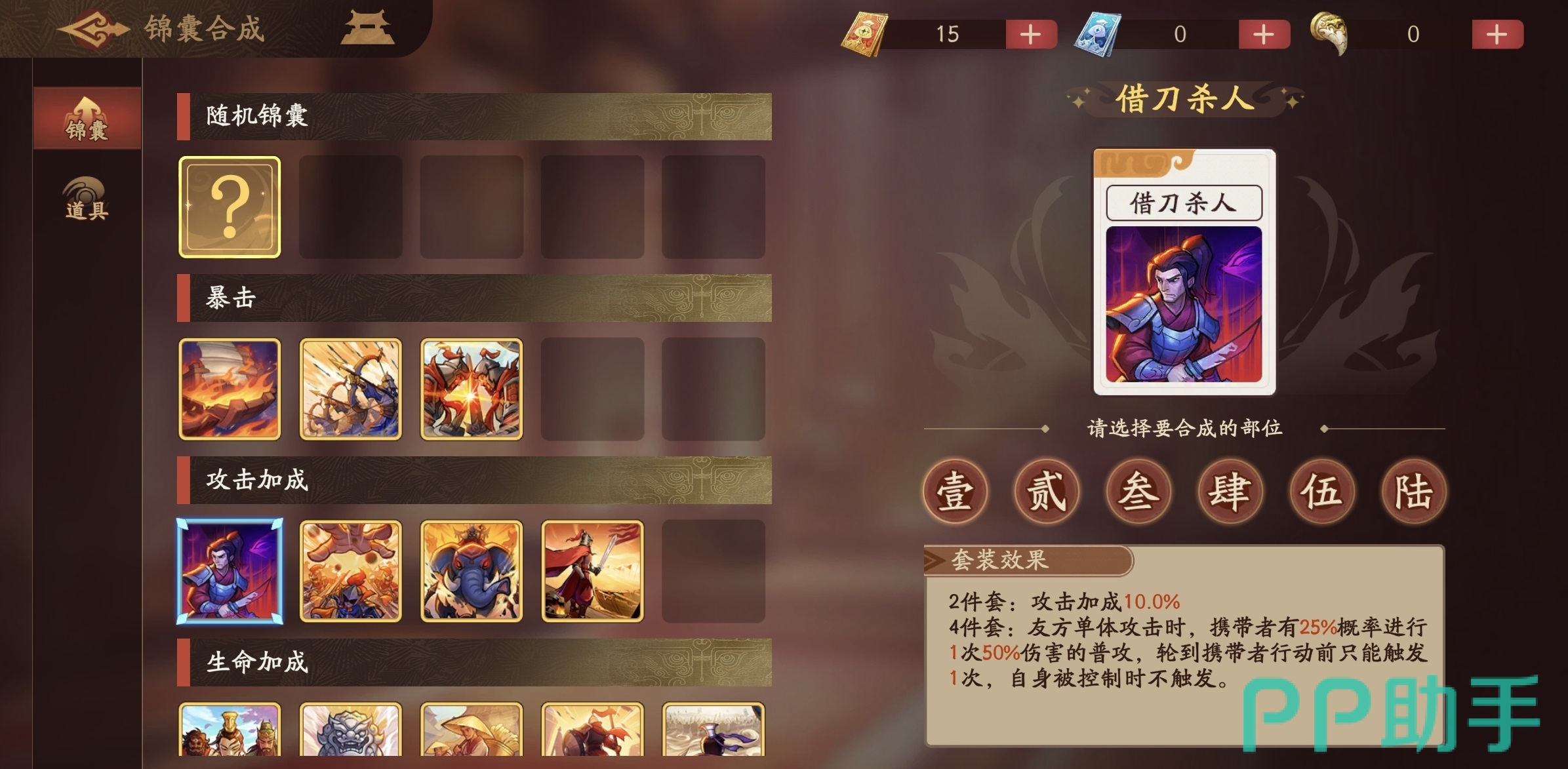 在装备搭配上,“剑阁摄权”为其首选专属武器,除提供基础攻击加成外,还能在每次获得“权”时附加一次额外层数获取概率,显著加快叠层节奏。锦囊组合方面,“借刀杀人”四件套效果契合度极高——当友方单体攻击命中时,钟会有概率追加一次普攻,进一步强化“权”的累积效率,形成良性循环。