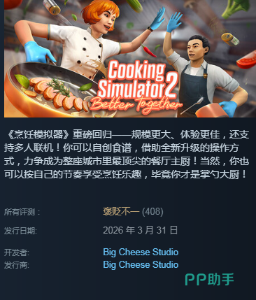 本作将于2026年3月31日正式发售,涵盖单人剧情模式与多人合作模式。引擎层面全面重构,引入全新物理模拟系统,使切菜反馈、油温变化、颠锅动作等交互更具沉浸感。例如,不同食材的切割阻力、锅具导热响应、火焰强度对烹饪节奏的影响均被细致建模。多人模式最高支持四人同屏协作,玩家可依专长分工完成备料、烹制、装盘等环节,高效应对高峰订单压力。此外,角色外观、厨房布局、厨具组合等自定义选项也迎来大幅扩展。