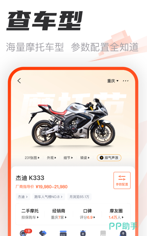 摩托范是一款专业的查价平台,该平台收录了当前比较热门的摩托车品怕的价格以及品质,而且还有专门的社区进行讨论,其平台的价格是非常精准,而且还能进行二手方面的销售,其专业度还是受到了广大网友认可的。