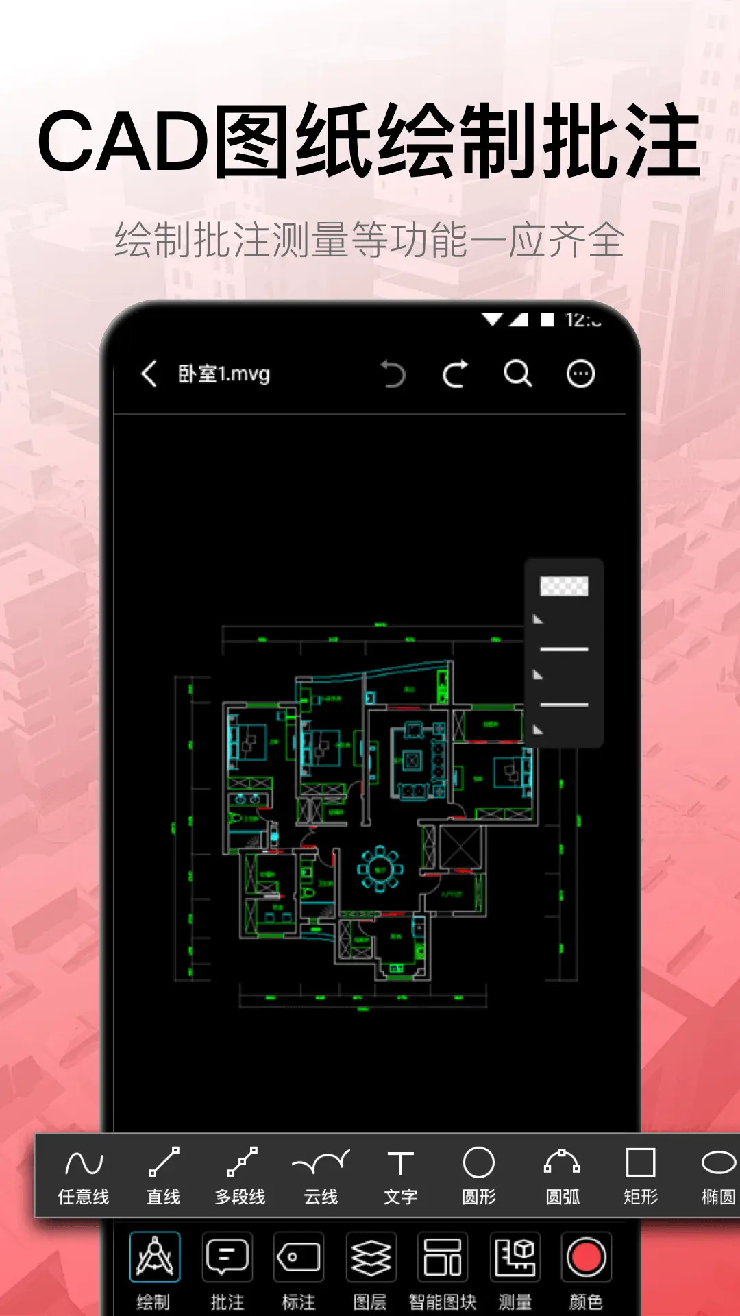 在建筑领域广泛应用的工具,通过手机就能轻松接收各种社交软件发过来的图纸,一键打开之后不会显示各种乱码情况。可以在这里进行后续的批注、测量、标注和各种查找等功能。能进行专业化管理,不同图纸按照类型都会分门别类收藏起来,使用的时候更加方便。