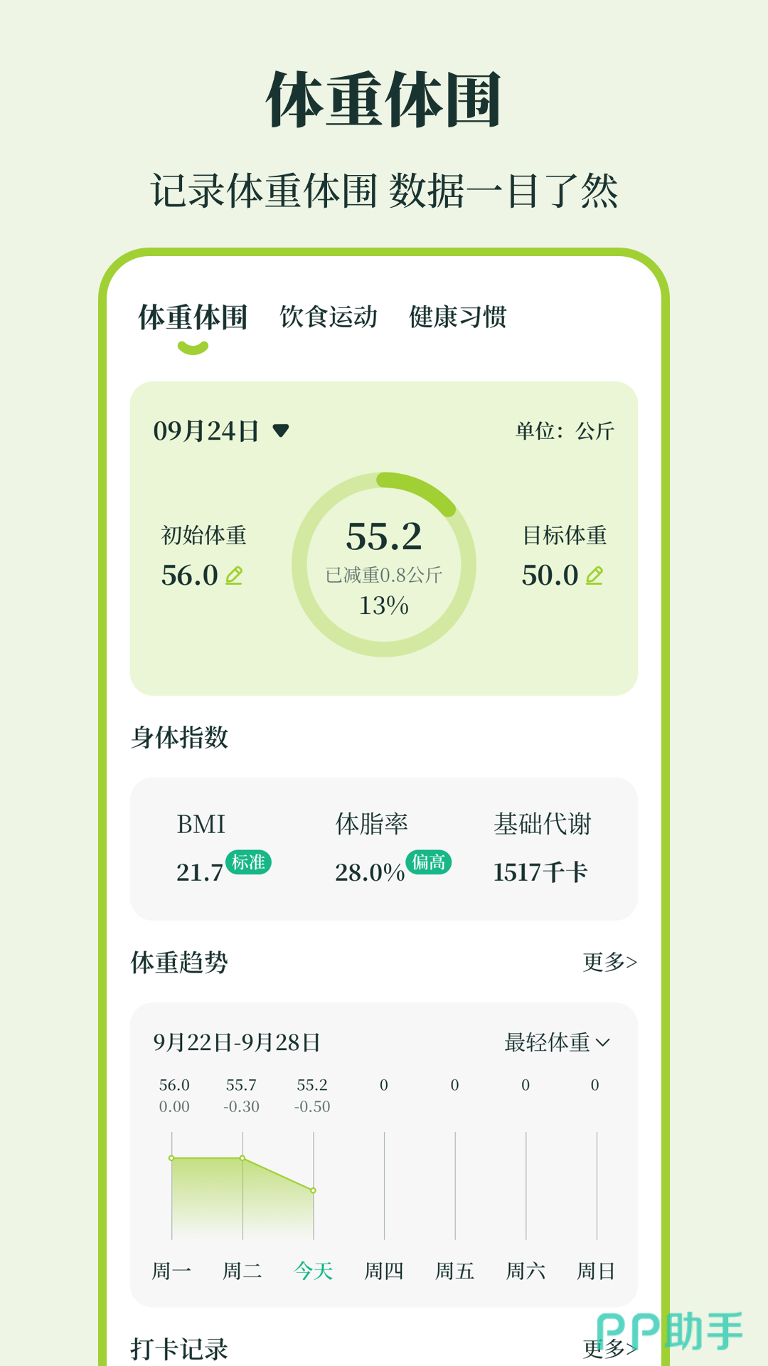 主要记录的是体重、体型、体围等各种相关数据,采用图表的展现形式让。用户可以一目了然的掌握当前的变化。能够帮助对每天饮食的卡路里进行分析,进行热量计算等,从全方位角度实现瘦身打卡。还能建立起属于自己的身体档案,记录下更多的数据来更好的进行计划。
