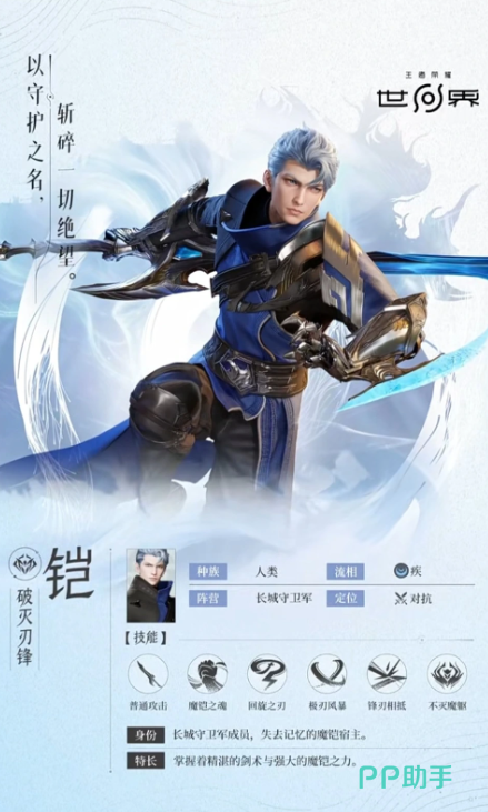 铠出身于古老海都家族,为嫡长子,自幼承袭魔铠血脉之力。其一技能“回旋之刃”可投掷飞刃,命中目标后产生弹射效果,对路径上多个敌人造成物理伤害;飞刃返回时为自身恢复一定生命值。二技能“锋刃”开启后进入短暂格挡状态(持续0.5秒),若成功抵挡敌方攻击,则立即触发极刃反击,对前方扇形区域造成高额伤害。三技能“魔躯”激活后,铠将进入强化形态,获得霸体效果,并提升自身所有技能的物理输出能力。