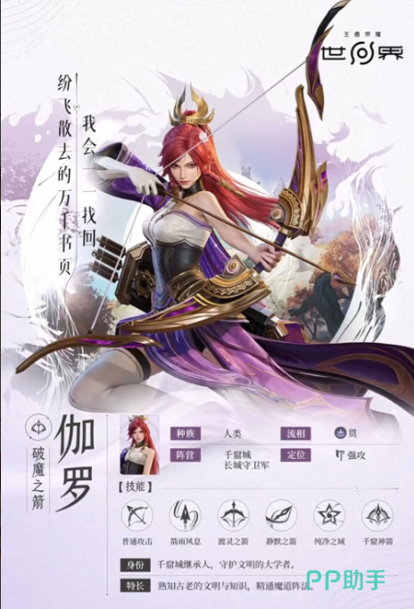 伽罗来自千窟城,身为该地正统继承人,因追查一场神秘火灾真相而加入长城守卫军。其一技能“静默”向前方射出一支穿透箭矢,对命中的首个目标造成物理伤害并附带击飞效果,同时强化下一次普攻,使其变为三连发远程射击。二技能“纯净”在指定区域展开能量场,对范围内敌人施加击飞控制,伽罗身处其中时,自身暴击率获得显著提升。