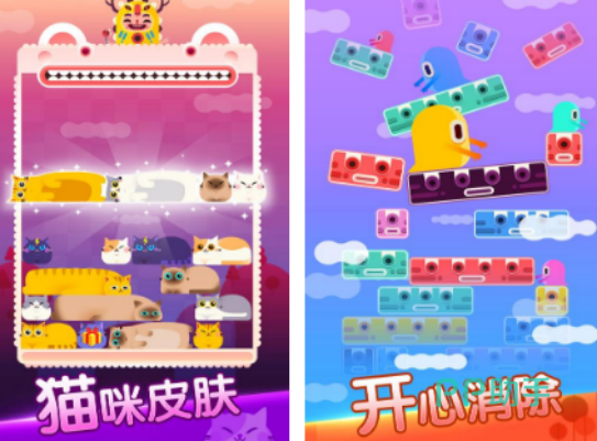 既轻松又休闲,可开启开心消除的游戏,里面的方块无论是颜色还是设计都是比较独特的,甚至还有独特的猫咪皮肤,玩法就是需要你根据显示出的方块合理的移动,通过将每一种颜色移动在一起的情况下,就有机会完成消除任务,游戏简单容易上手,也能使用指尖操作的方式,开启无限的消除乐趣,多种主题,也能让大家选择。