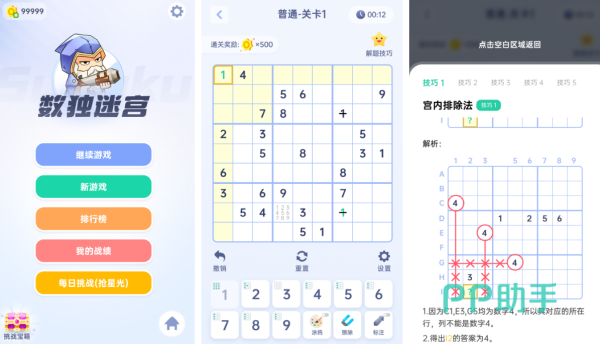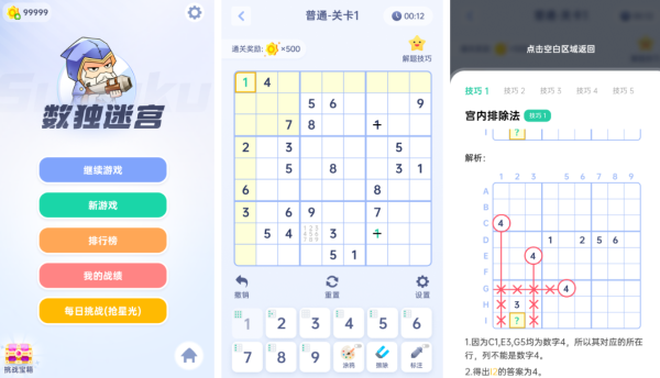 该游戏以经典数独解谜玩法为主,其涵盖了4×4、6×6、9×9的标准数独玩法以及杀手数独,异形数独等数10种数独变体模式,且每个变体模式在游玩前都会有详细的教学内容。同时其从入门到高阶难度得到了全覆盖,并为玩家提供了数字标记,高亮提示等辅助功能,是锻炼逻辑推理和专注力的经典选择。
