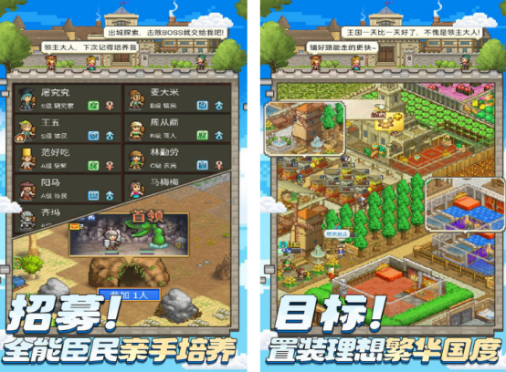 融合城市建设、角色养成与轻度战斗的复合型像素模拟游戏。玩家担任王国建设者,通过建造住宅、工坊、神殿等功能建筑吸引居民入驻;招募具备不同特长的臣民(如战士、工匠、商人),分配至对应岗位提升产出效率。支持宠物系统,可收集并培养多种战斗型宠物参与副本征战,图鉴完整,成长路径清晰。亦开放好友互助功能,便于资源共享与协同开发。