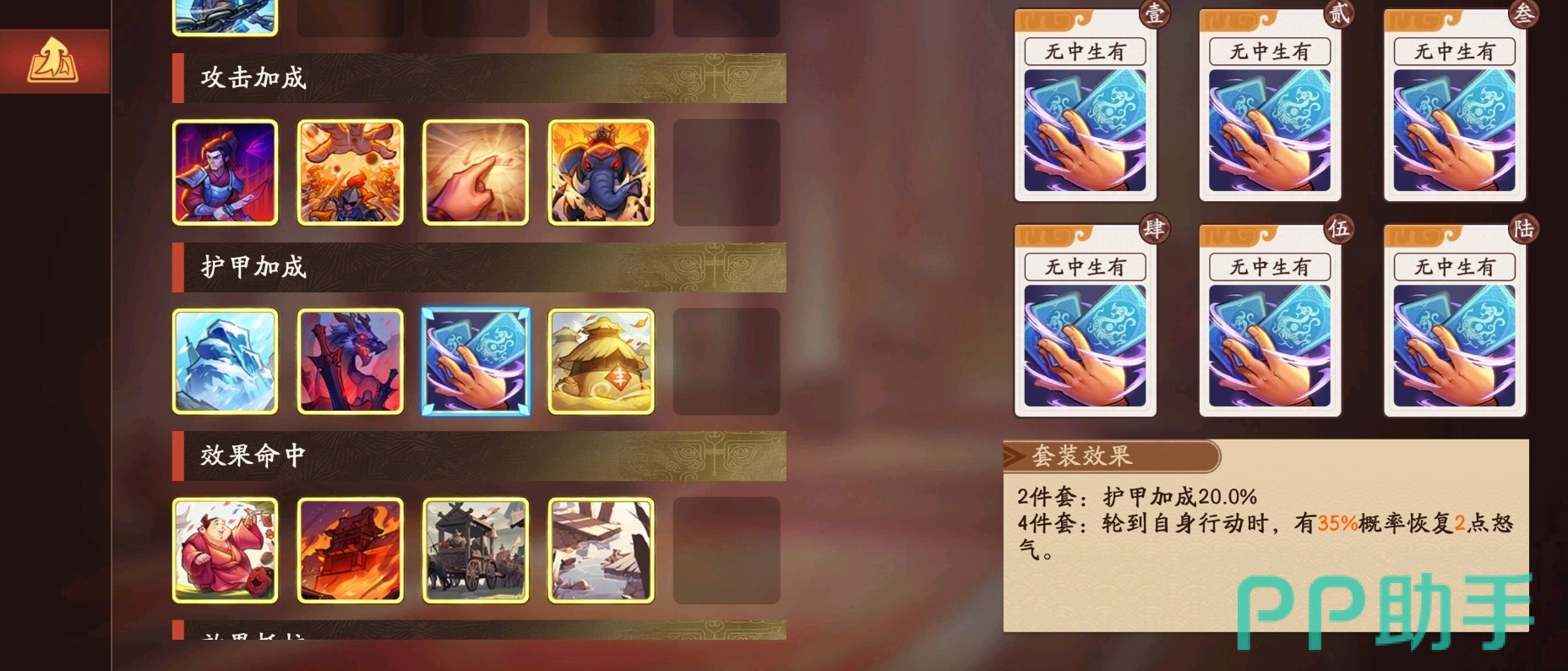 装备配置方面,主套装推荐【无中生有】四件套,辅以生命值或护甲属性的两件套。副属性优先级为:速度>生命值>护甲。其中,4号位选择速度词条,5号位与6号位均选用生命值或护甲词条。选用【无中生有】旨在保障全队怒气循环稳定,避免技能释放断档。专属武器可选【周郎顾曲】或【妙笔】,前者能于开局即提升全队伤害,进一步强化关羽的终结能力。