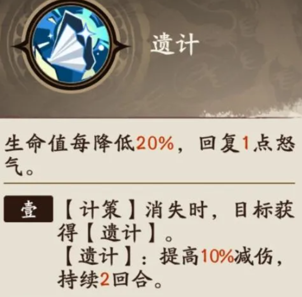 郭嘉的天赋【遗计】具有双重响应逻辑:每当自身生命值下降20%时,自动恢复1点怒气;当所施加的“计策”效果结束时,自身获得10%伤害减免,持续2回合。其普通攻击对单体目标造成100%基础伤害;必杀技则强制扣除自身20%最大生命值(若当前生命不足,则保留1点),同时为自身附加10%减伤效果并使随机2名队友获得“计策”——优先选择同列单位。“计策”在持有者回合开始时每层提供1点怒气,最多叠加2层,持续1回合。