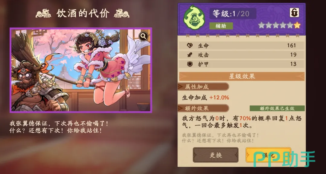 次优选择包括【饮酒的代价】与【我们仨】。前者提供12%最大生命值加成,并在己方怒气为0时,以70%概率恢复1点怒气,增强低怒气状态下的技能启动容错率;后者则提升携带者治疗效果10%,且当任一队友回合结束时,为其恢复相当于已损失生命值6%的血量,进一步强化团队续航与联动稳定性。