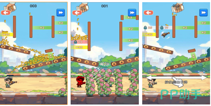 创新融合射击元素与配对逻辑:玩家操控枪手发射不同颜色/功能的子弹,需使同类型子弹碰撞触发消除效果。弹道物理模拟真实,反弹路径可预测,策略重心从“找相同”转向“控轨迹”。角色动作诙谐,音效清脆,单局时长控制在90秒内,契合快节奏休闲需求。技能子弹含冰冻、爆炸、穿透等差异化效果,提升重复可玩性。