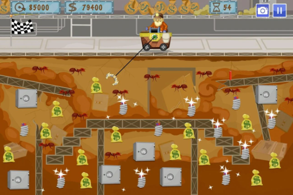 主打本地双人同屏交互,提供合作闯关与实时对抗两种模式。玩家需独立操控钩索系统,在有限时间内争夺黄金、钻石等稀有矿物,同时规避岩石、断层等环境障碍。内置多类增益道具,如磁力吸附、时间延缓、钩索强化等,显著影响策略选择与胜负走向。