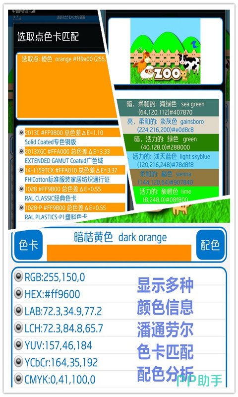 不管是图片上的颜色,或者是用户拍照上传的颜色,在颜色识别器中都可以得到识别。只需要在颜色识别器点击你想要识别的颜色,软件便会自动显示出其信息,还可以为用户推荐其经常使用的颜色搭配,帮用户节省时间。