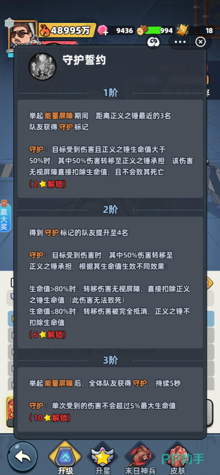 技能守护誓约,当正义之锤举起屏障时,身边的三位队友将会获得守护标记,其受到的伤害将会转移50%给正义之锤。技能烈焰打击施展之后,将会对前方发射能量波,位于技能伤害范围内的4名敌人将会受到300%的伤害,每命中一名敌人可获得5%的屏障充能。该技能升至二阶时,可命中5名敌人每次能够使自身的生命值恢复2.5%。升至三阶时,屏障的充能数值将会提升至6%同时被打到的敌人都会获得破甲状态,持续三秒,在此期间所受到的所有伤害都会提升10%。