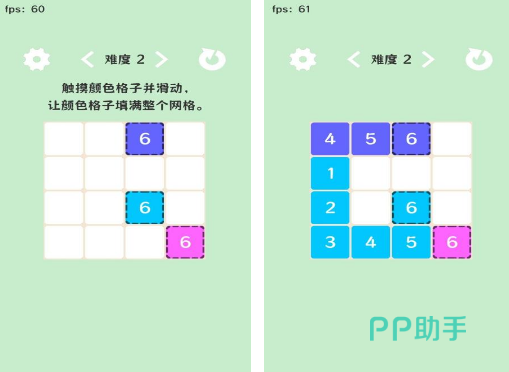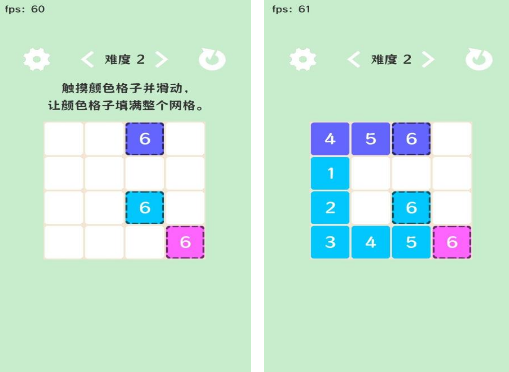 考验玩家手速以及脑力的游戏,需要在以方格组建的游戏中,根据显示出的数字,以及不同的格子颜色触摸并滑动,如果可以使相同颜色摆满整个网格,那么就可以完成相应的挑战任务。也是老少皆宜,充满趣味性的,在玩的时候需要凭借着灵活的手指进行操作。还要尽可能的在完成任务的时候,使用更短的时间。