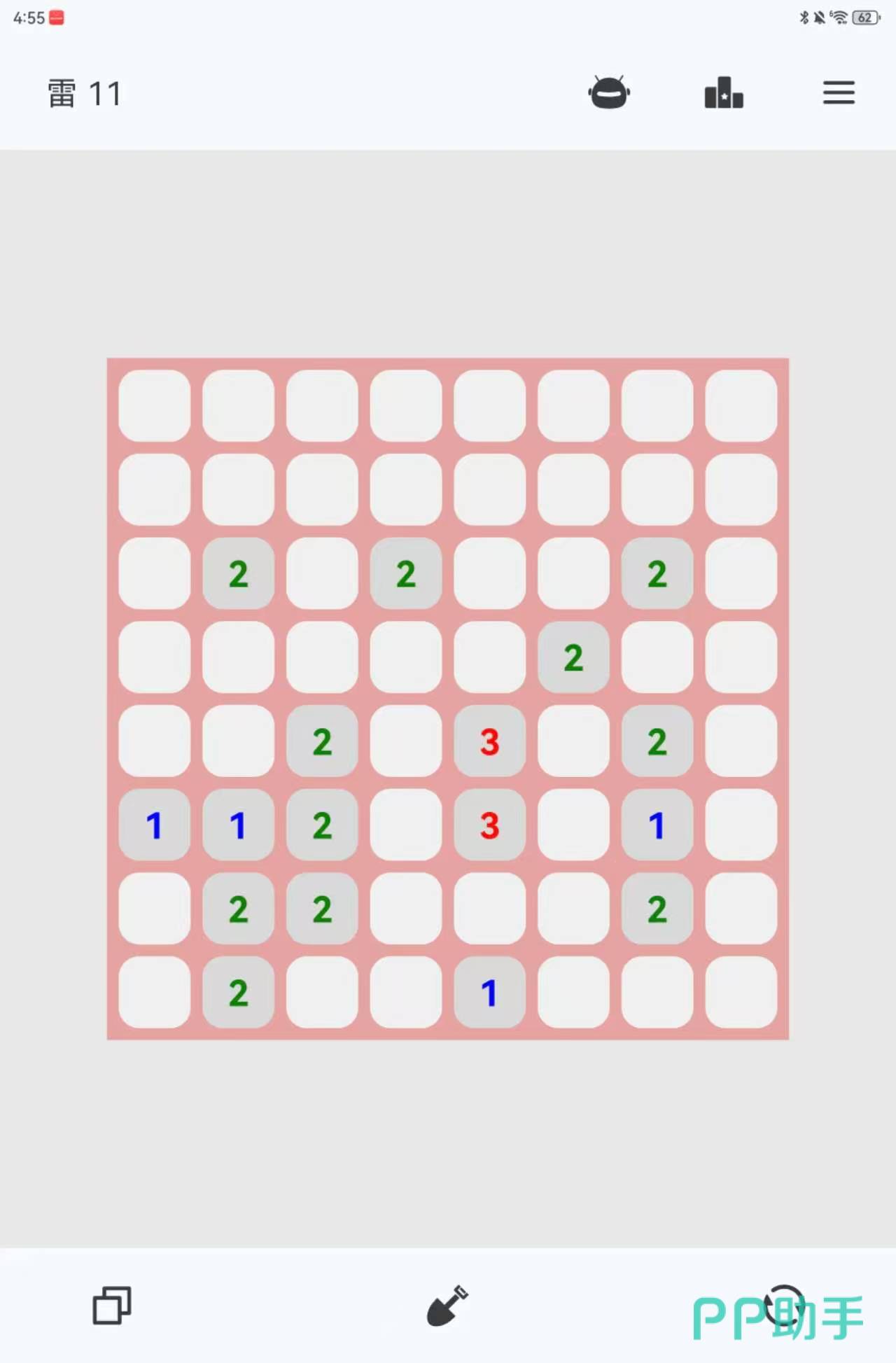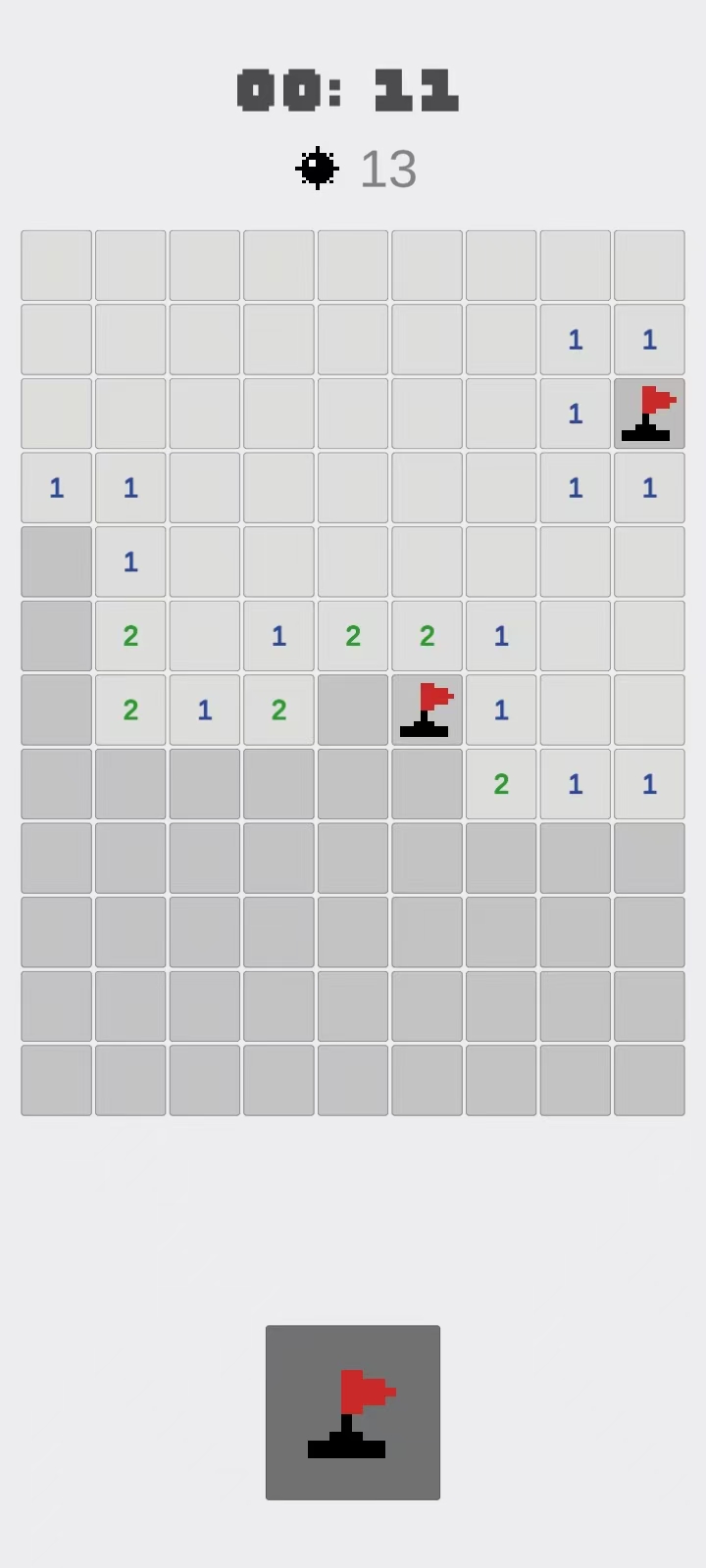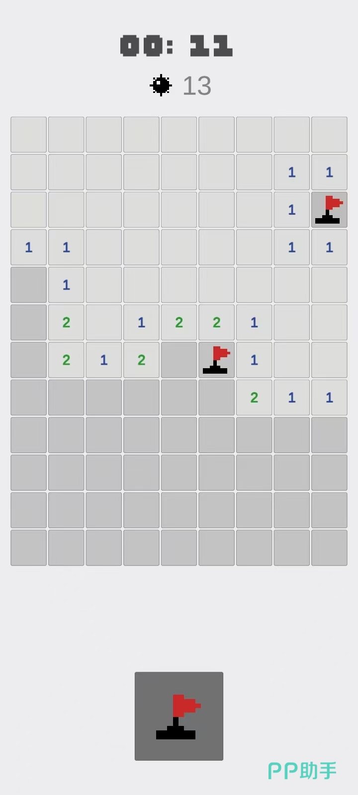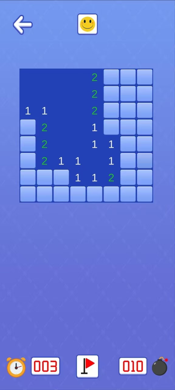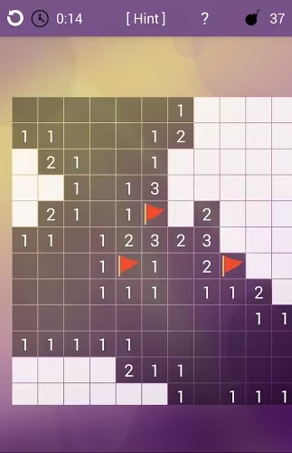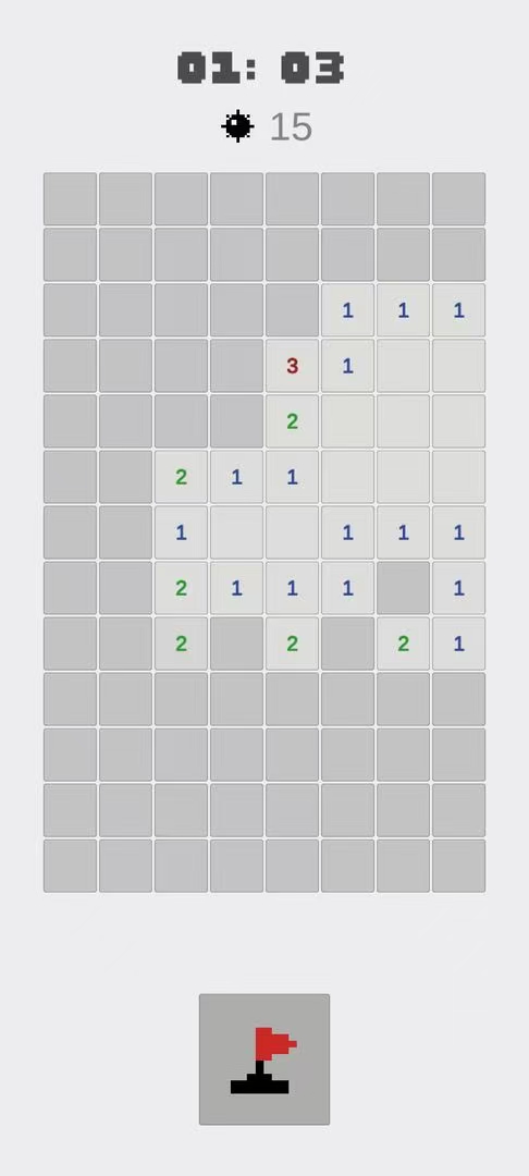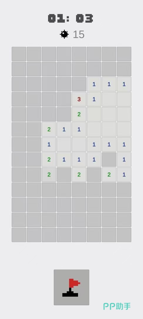 这是经典电脑装机游戏扫雷的手游版本,由于手机屏幕限制,玩家在对局中需要通过双指的滑动来移动画面或者是放大缩小画面。在开局以后,玩家点击屏幕翻开方块,被翻开的方块上的数字代表着这个方块周围的地雷数量,玩家需要据此将所有的地雷找出排除。