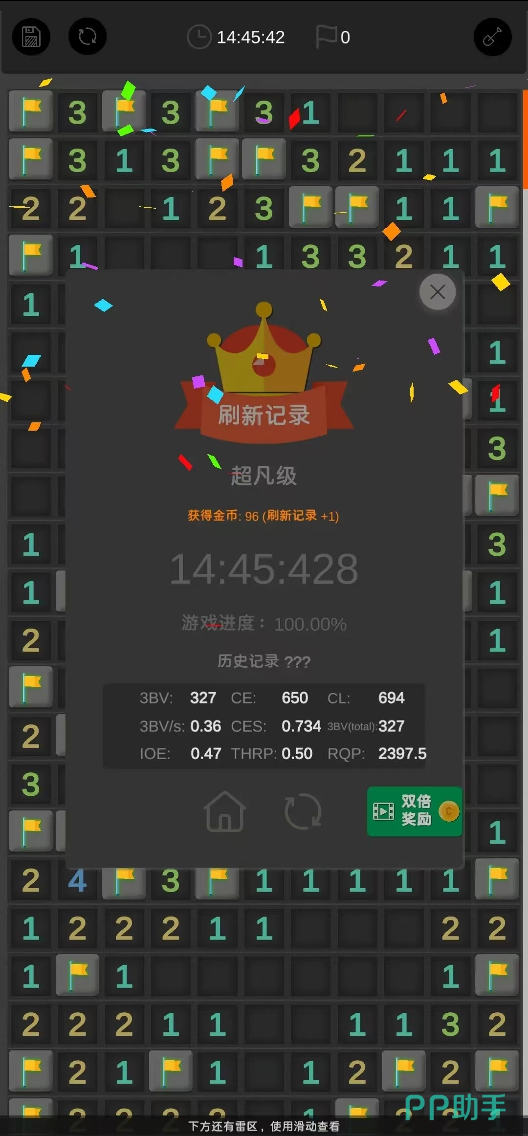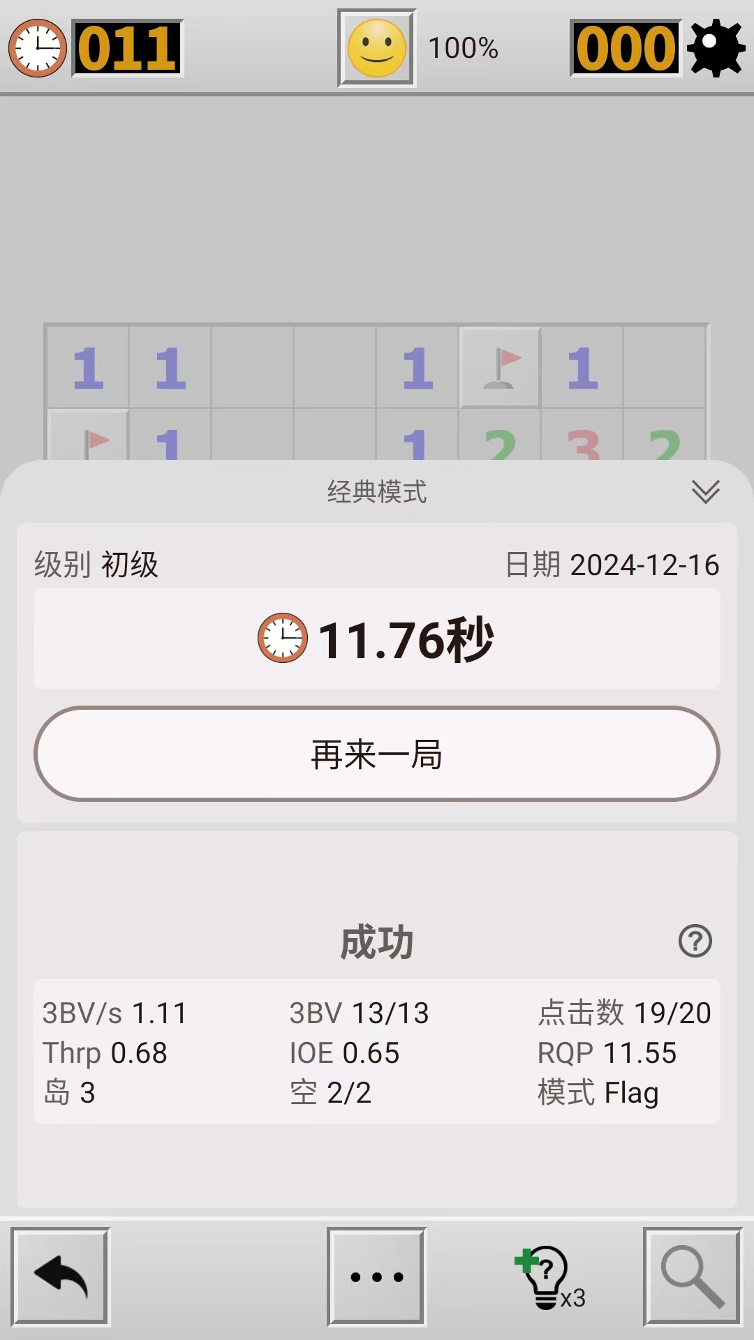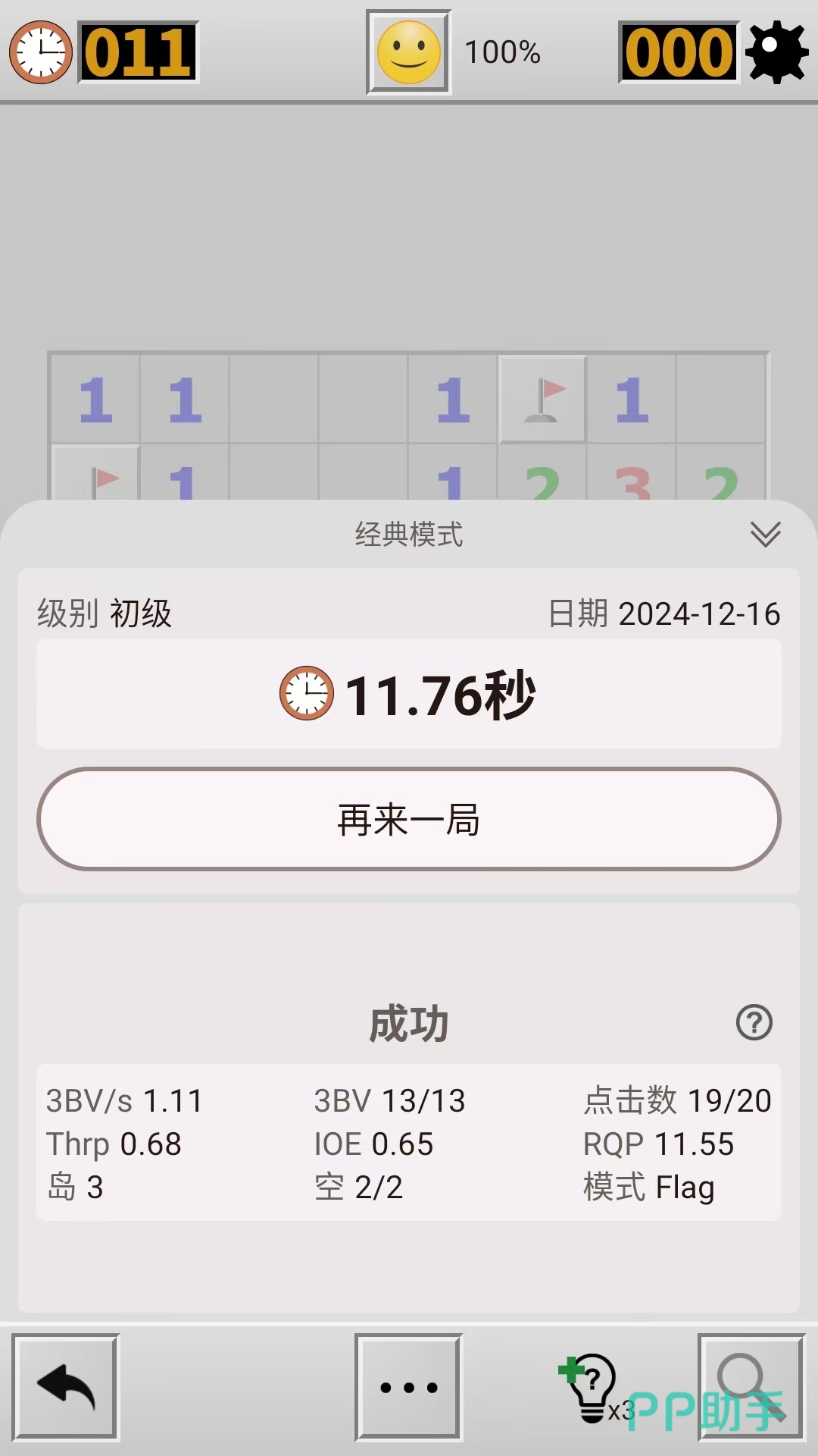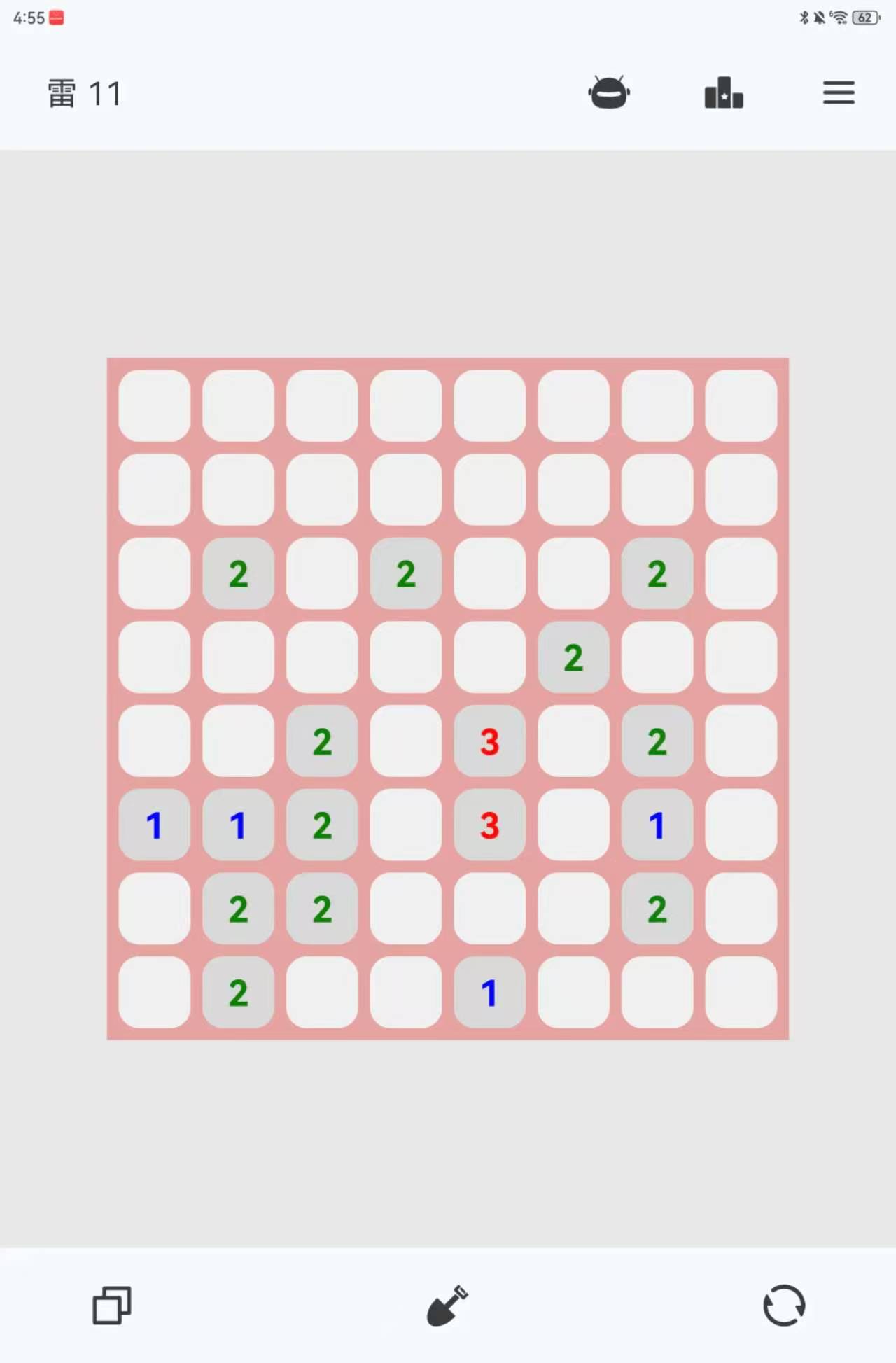 这是经典电脑装机游戏扫雷的手游版本,由于手机屏幕限制,玩家在对局中需要通过双指的滑动来移动画面或者是放大缩小画面。在开局以后,玩家点击屏幕翻开方块,被翻开的方块上的数字代表着这个方块周围的地雷数量,玩家需要据此将所有的地雷找出排除。