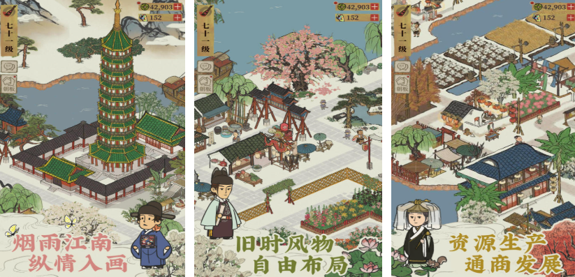 《江南百景图》使用的是浓郁的中国水墨画风,以其精美的画质以及休闲的玩法受到很多玩家,而玩家的核心玩法就是建造城市。手游的自由度很高,玩家可以自定义道路、居民区和树木种植区域,而每逢节日,还会有相应的奇遇的探索任务,方便玩家收集资源。作为古风模拟经营类手游,玩家还可以安排居民的居住环境以及工作内容,而这种合理分配工作的方式也可以快速提高生产率。