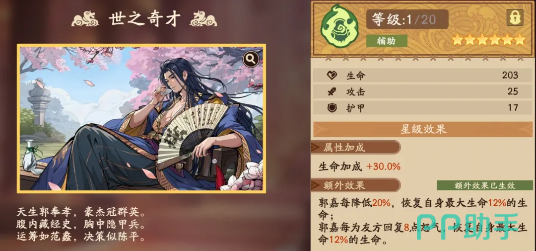 在《三国杀:武将觉醒》这款策略卡牌游戏中,郭嘉凭借其独特的机制设计成为众多玩家青睐的核心辅助角色。他的技能体系围绕“卖血”展开,既能通过损失生命值来为队友提供怒气恢复,又具备一定免伤效果;当自身生命值处于较低水平时,还能额外为友方单位回复生命,堪称兼具续航、支援与战术调度能力的多功能型辅助武将。