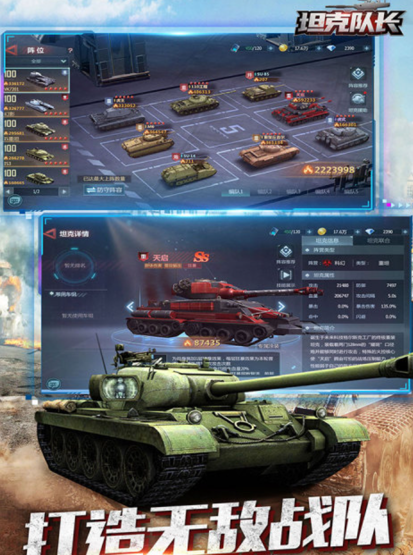 二战背景下收录了虎式、T-34、谢尔曼、黑豹、IS-2这些传奇坦克,按轻型中型重型自行火炮反坦克炮五类划分。属性技能定位差异化互相克制,轻型机动中型均衡重型抗伤火炮远程输出反坦克破甲,还原真实历史性能和外观细节。建模精细涂装可自定义,基地建设加坦克养成加关卡闯关是核心玩法。