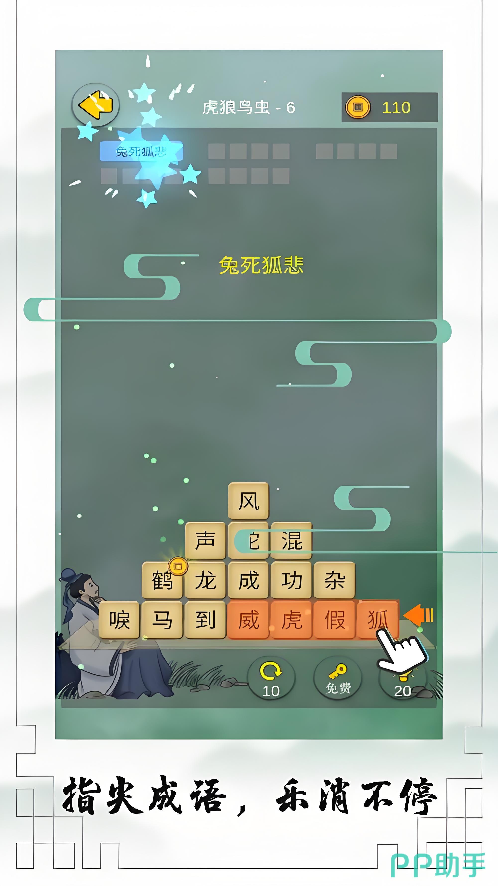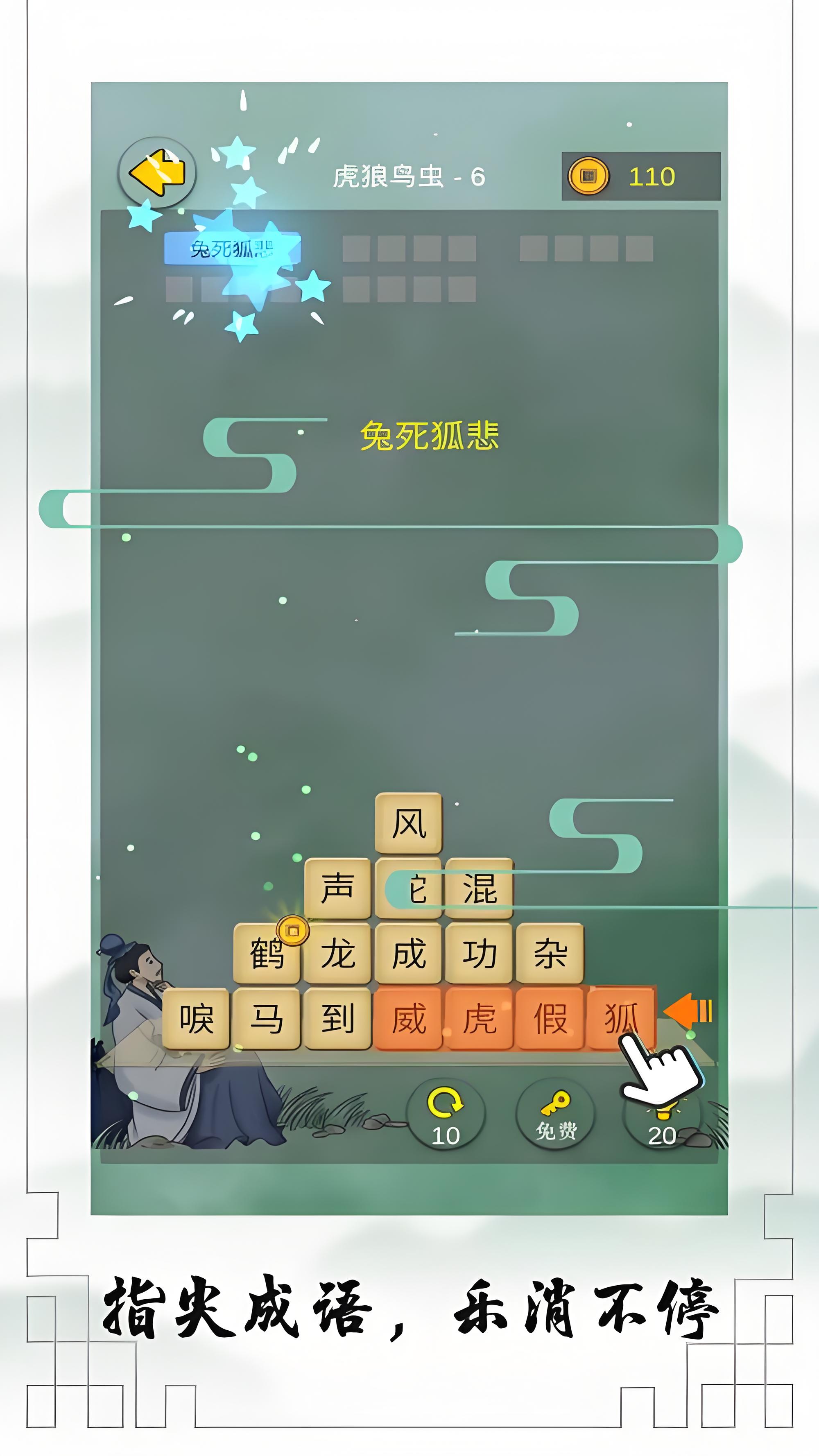 纯纯的成语接龙竞技,规则简单粗暴:上一个成语的尾字当下一个字的首字,界面只给成语首位,中间字需要玩家填写。题库从成语词典中添加了将近3000多条,从童生到翰林文圣共500关。游戏的爽点在速度奖励上——答题越快积分倍率越高,手速和词汇量双重dee考验。每关解锁的成语故事模块很适合像小编一样的“文化人”。难度属于循序渐进,新手和成语爱好者都能找到适配的节奏。