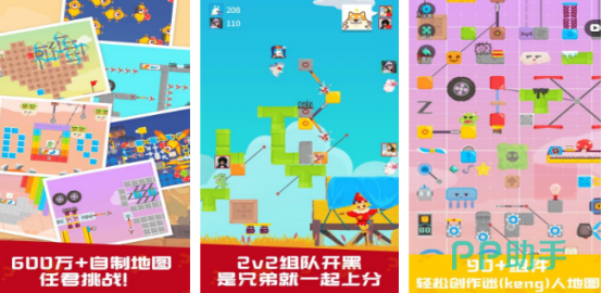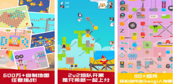 基于沙盒建造机制设计,内置百余种可交互组件,涵盖仙人掌、水母等趣味元素,支持自由搭建地图场景。社区已沉淀超数百张玩家原创地图,覆盖微操挑战、音乐解谜、剧情叙事等多种类型,拓展深度探索与创意表达空间。本作支持2至4人实时在线匹配对战,响应迅速,适配主流移动设备性能。