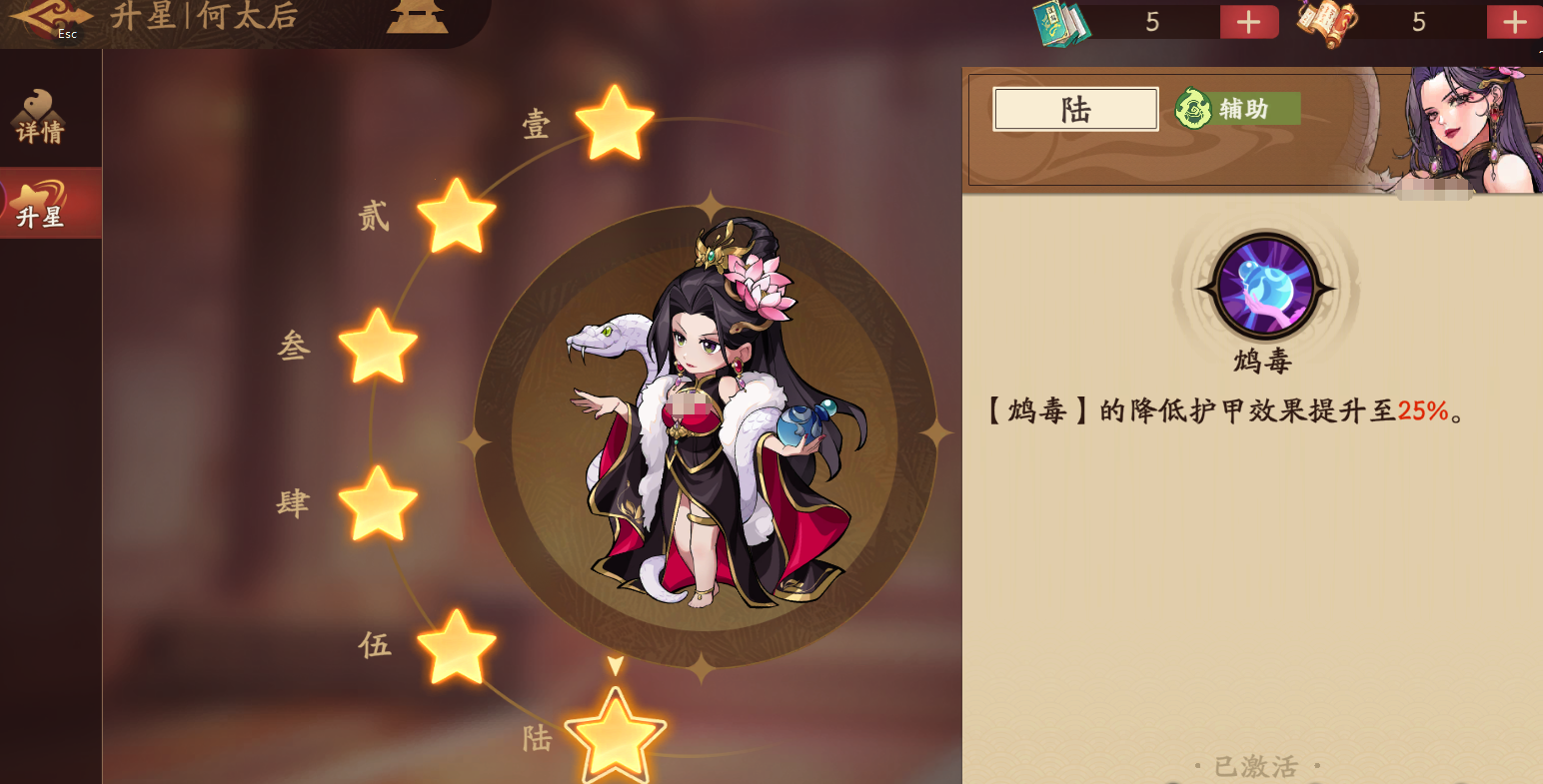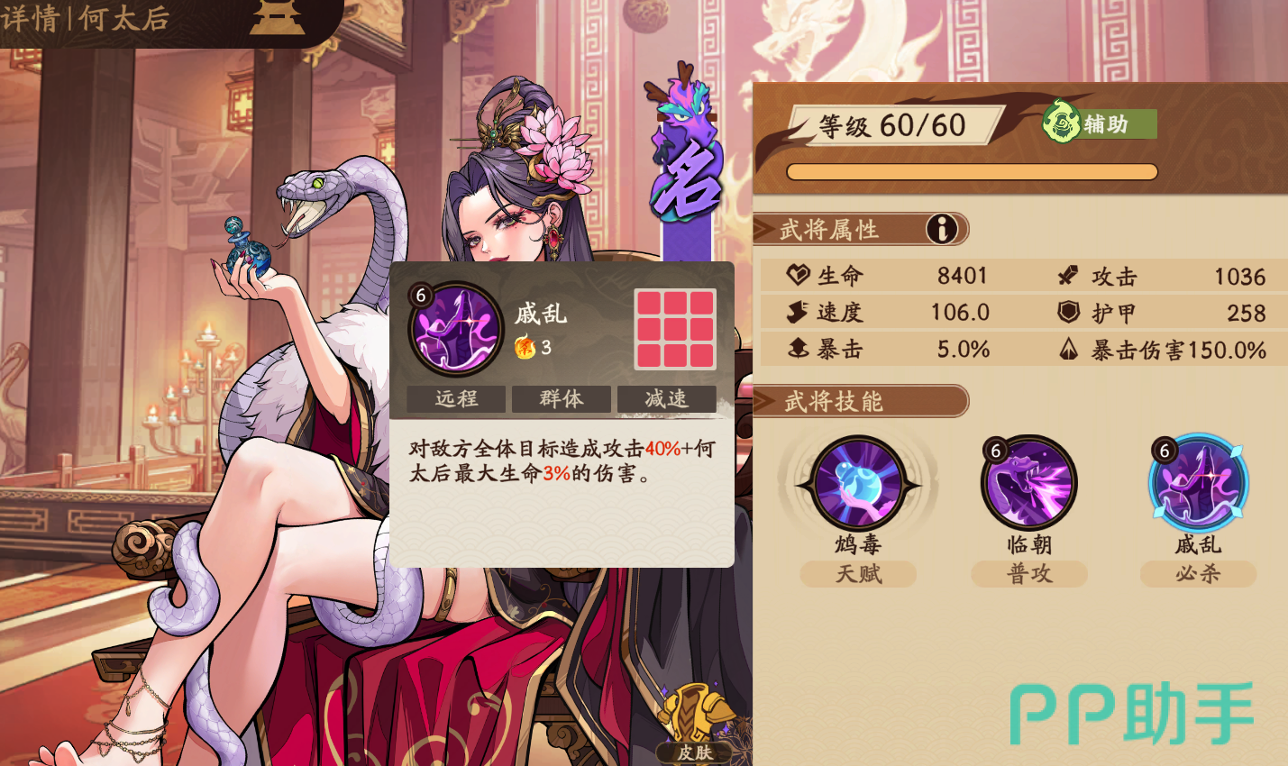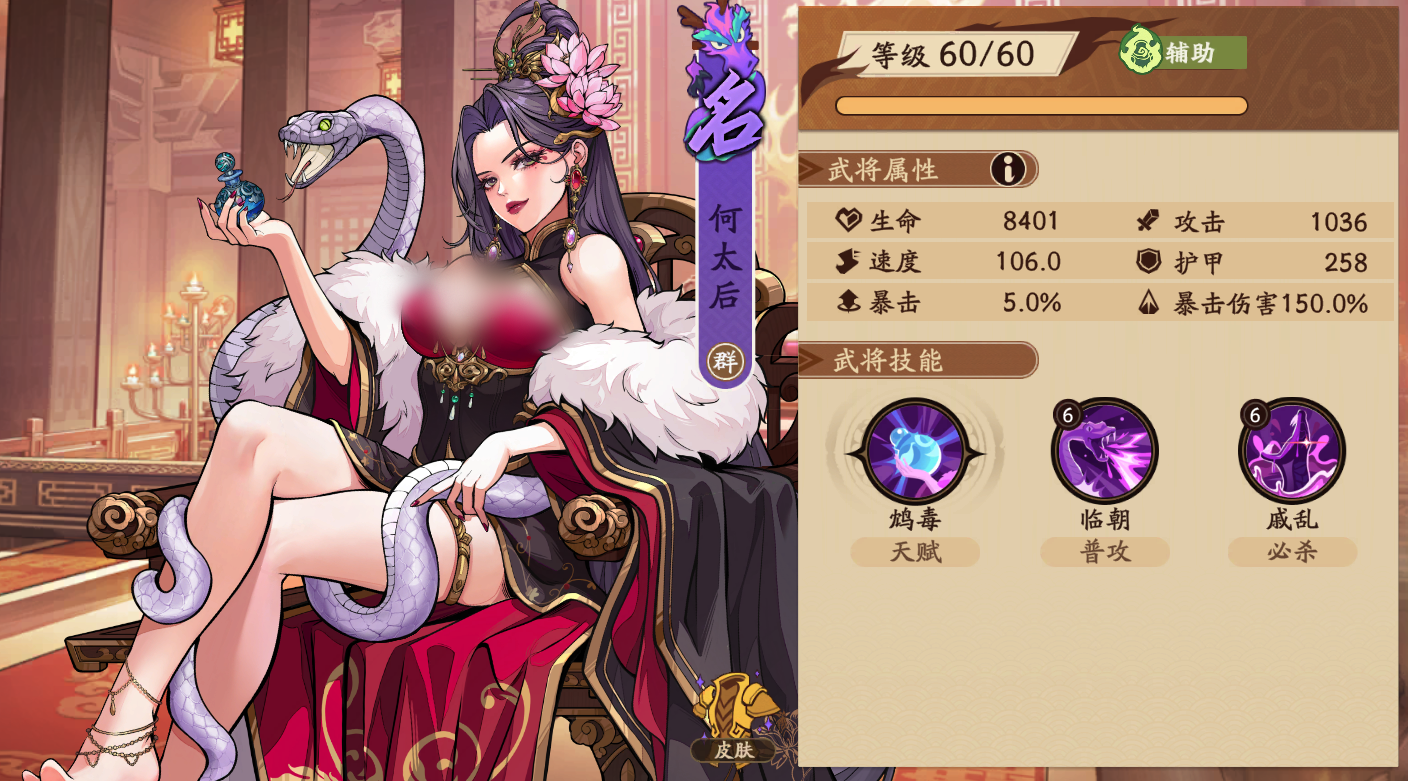 何太后属于紫色品质名将,初始速度高达106,在全角色中处于前列水平。其定位明确为后排辅助型武将,核心作用在于持续施加负面状态、削弱敌方防御体系,并通过高生存能力支撑团队持久作战。推荐培养方向为生命值与速度双线提升——前者强化其站桩叠毒能力,后者保障其在多轮战斗中优先出手,稳定触发技能效果。