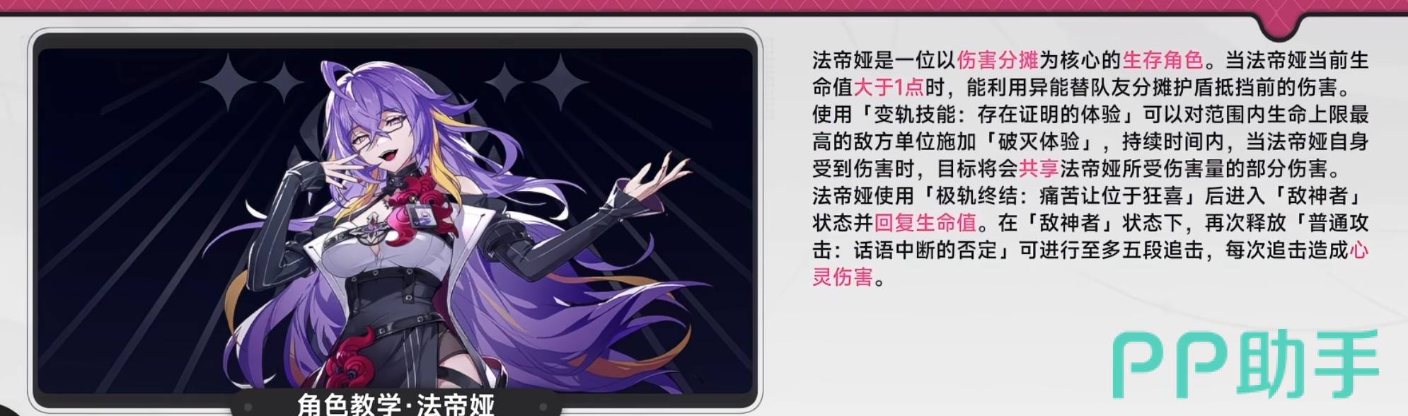 不同角色的极轨终结具备显著差异化机制。以法蒂雅为例:其极轨终结开启“敌神者”状态,彻底重构输出循环——期间造成6段潜意识伤害并同步恢复生命值;若在状态持续中立刻接续一次普通攻击,可激活追击链,最多触发5段连续追击。该状态在角色切换瞬间即失效,因此务必确保完整连招打完后再换人。另外,当法蒂雅当前生命值低于破灭阈值时,释放节能技可提升后续伤害倍率并恢复一定血量,形成“低血高爆”的策略闭环。
