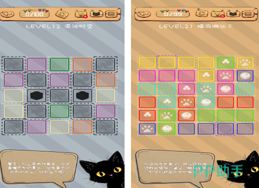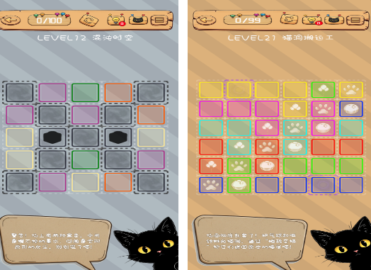 以猫咪形象贯穿全程的滑动解谜游戏,共设40余关。核心机制为行列循环滚动——玩家点击某一行或列,该行/列元素将整体向左/右或上/下位移,头尾相连形成闭环。目标是通过有限次操作,使每行每列均呈现特定图案序列。关卡由浅入深,前期重观察,后期考推演,对逻辑建模能力提出渐进式挑战。