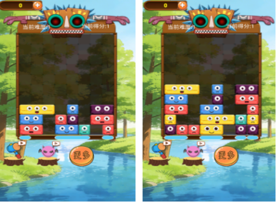一款以色彩识别与空间布局为核心的堆叠消除游戏。所有方块均采用Q版拟人化设计——圆润造型搭配灵动眼神与微表情,大块与小块间神态各异。玩家通过拖拽不同颜色方块至指定位置,完成匹配组合后触发消除反馈,积累积分解锁更高难度关卡。规则简明,上手零门槛,却蕴含丰富的策略延展性。