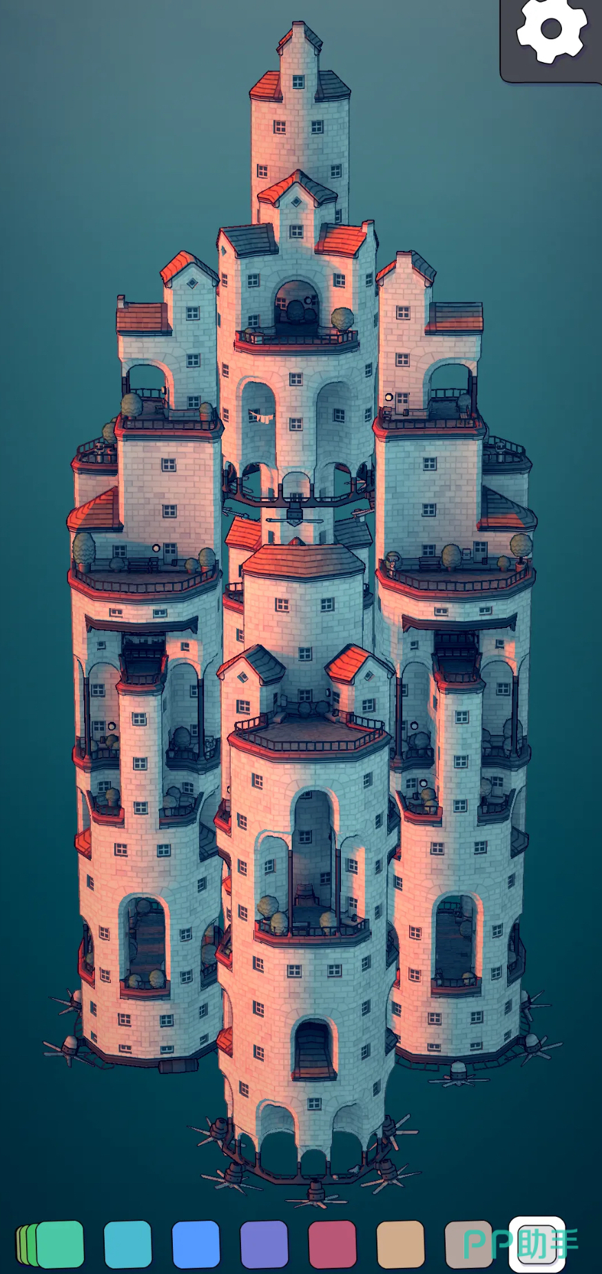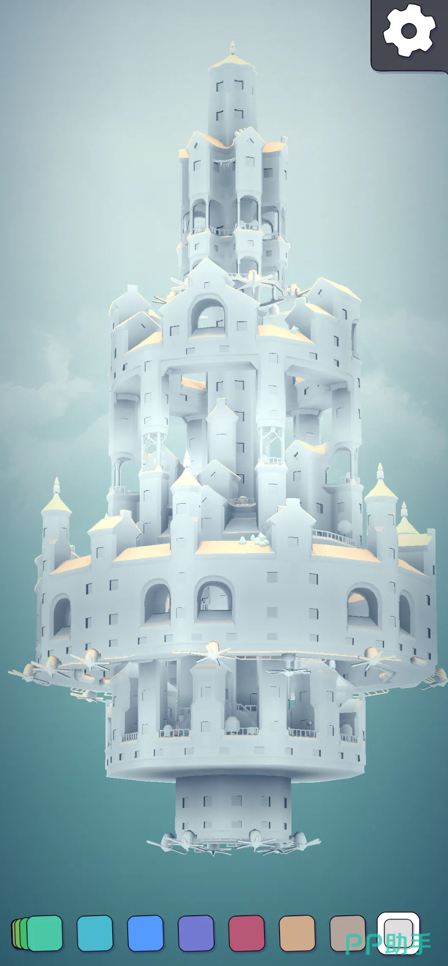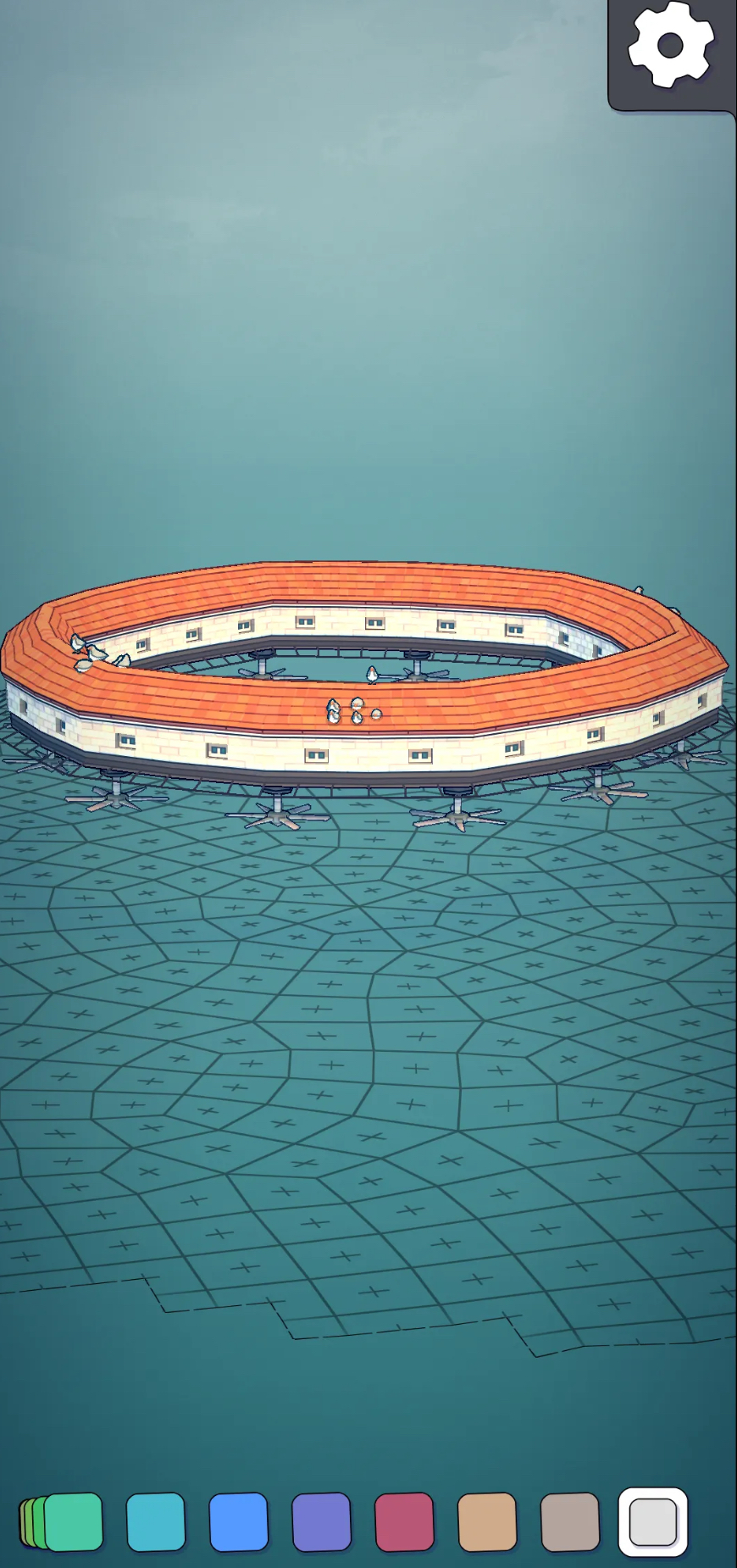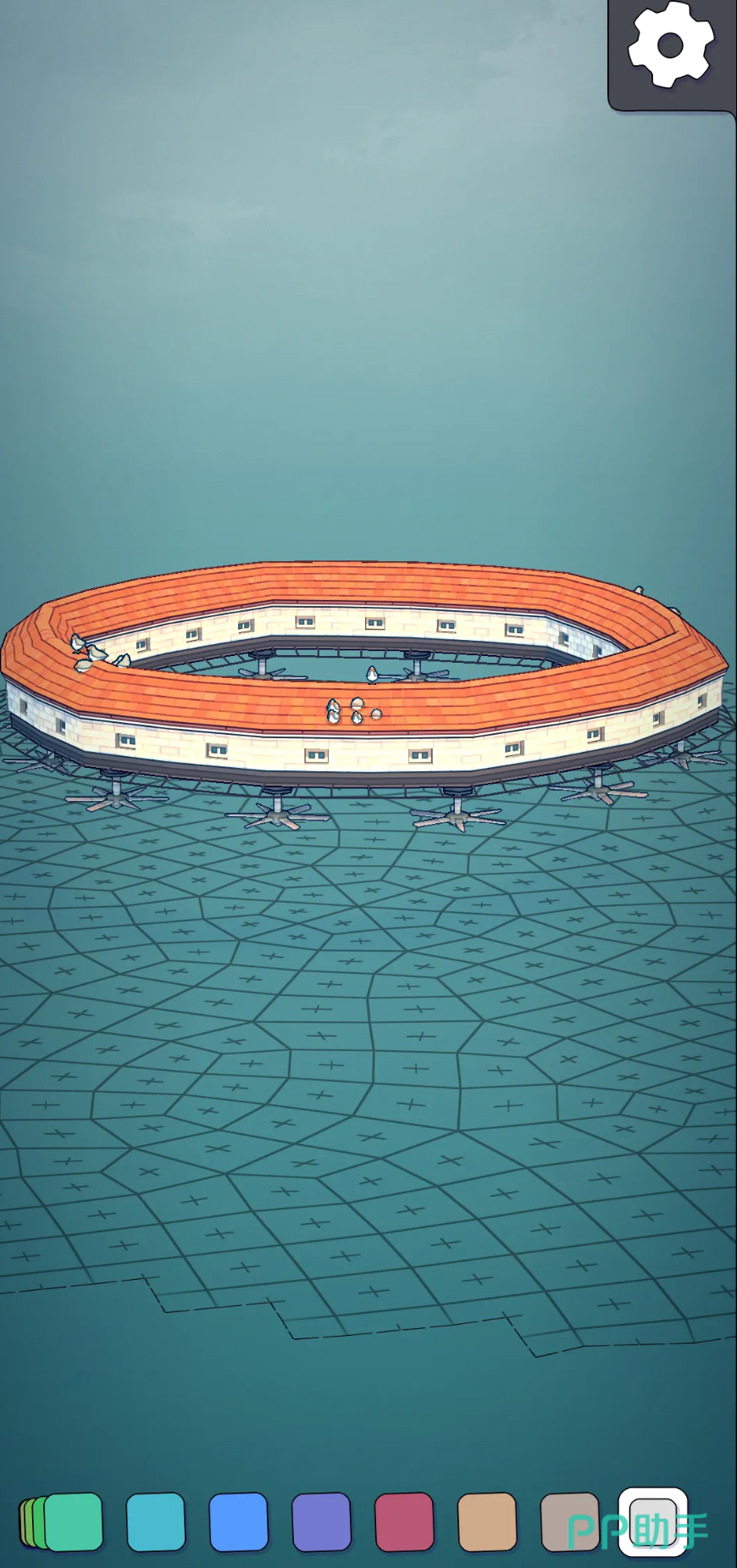 首先就是怎么进行基建,进入游戏之后会看到水面,点击屏幕就会落下一座建筑物,还伴有一些水花特效,过程非常的解压。建筑物是可以进行融合和叠加的,相邻的建筑物会融合在一起,向上叠加的房屋会触发钩子,有了钩子才能稳住整体的地基。同时游戏里的建筑是可以调节颜色的,还有三种不同的画风供我们进行调整,包括光线的角度和亮度这些都能够改变。另外,游戏的视觉效果也做的非常不错,这也是游戏最大的亮点之一。