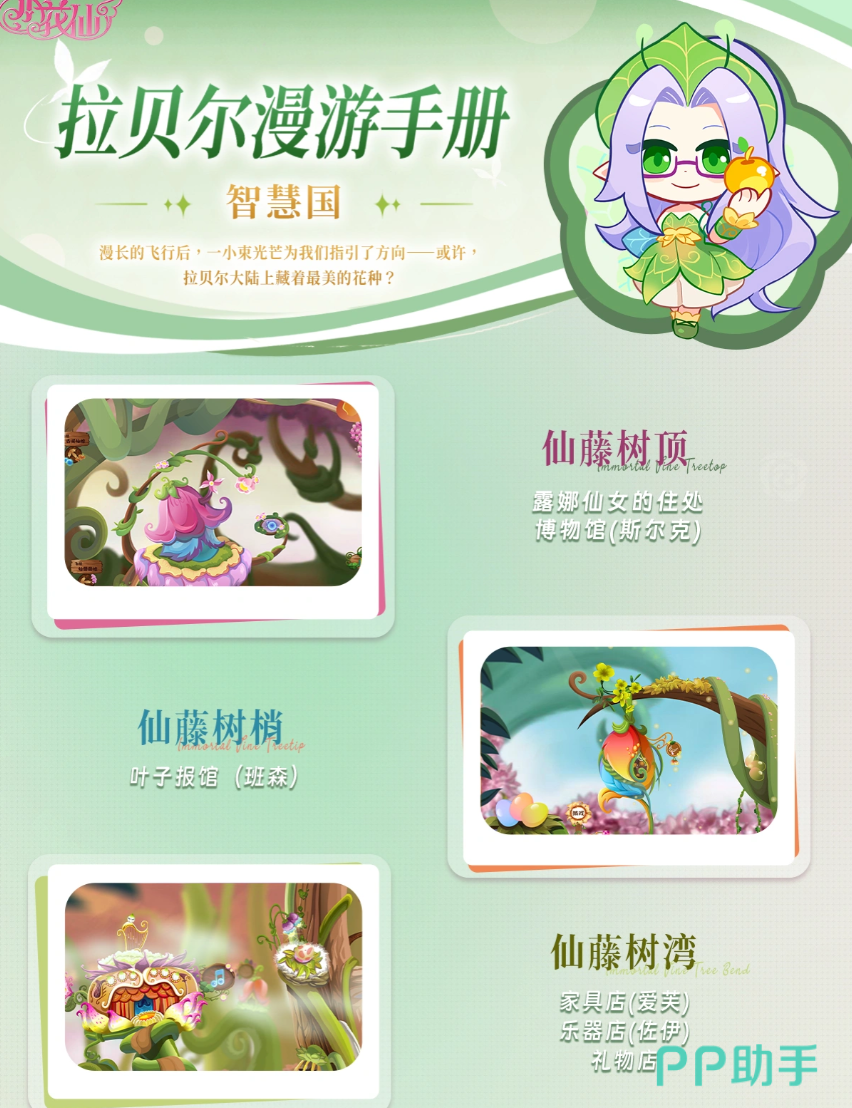 智慧国的居住地点以仙藤树为中心,分为仙藤树顶、仙藤树梢、仙藤树湾。仙藤树顶是露娜仙女的住处,也是博物馆(斯尔克)的所在地,仙藤树梢上坐落着叶子报馆(班森),仙藤树湾汇集了家具店(爱芙)、乐器店(佐伊)、礼物店。这些地点既是智慧国居民生活的地方,又是玩家进行智慧国的探索以及完成各种任务的地方。