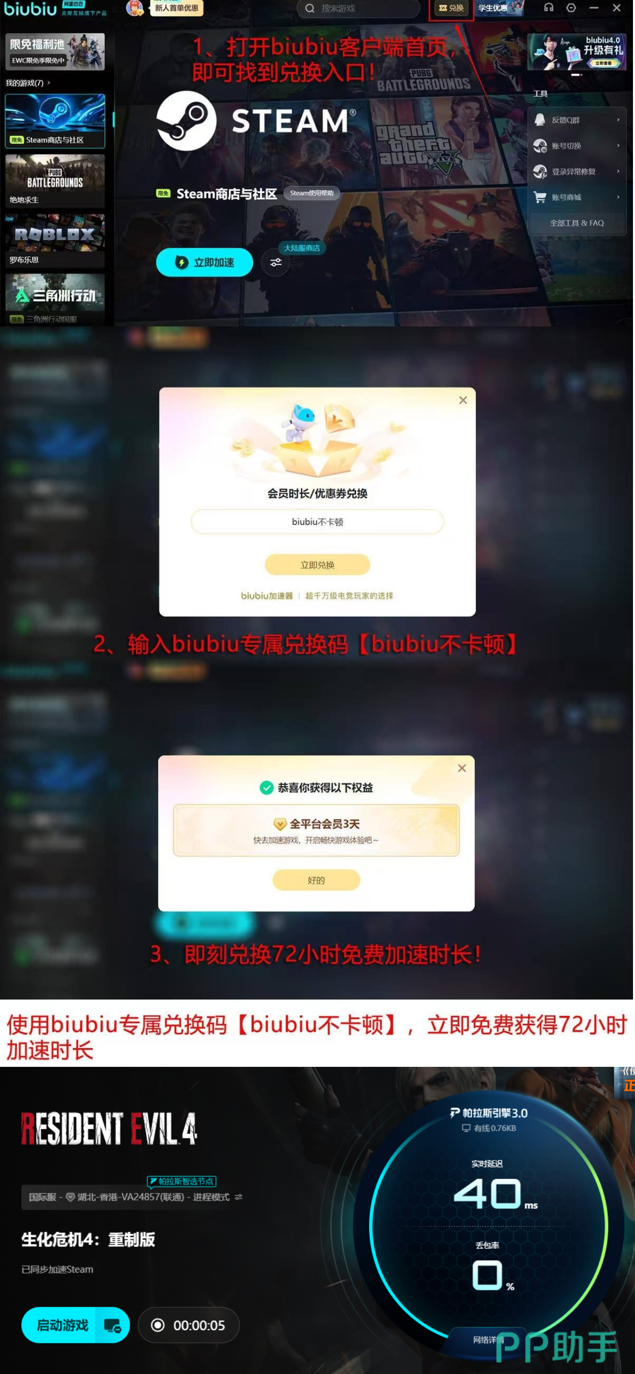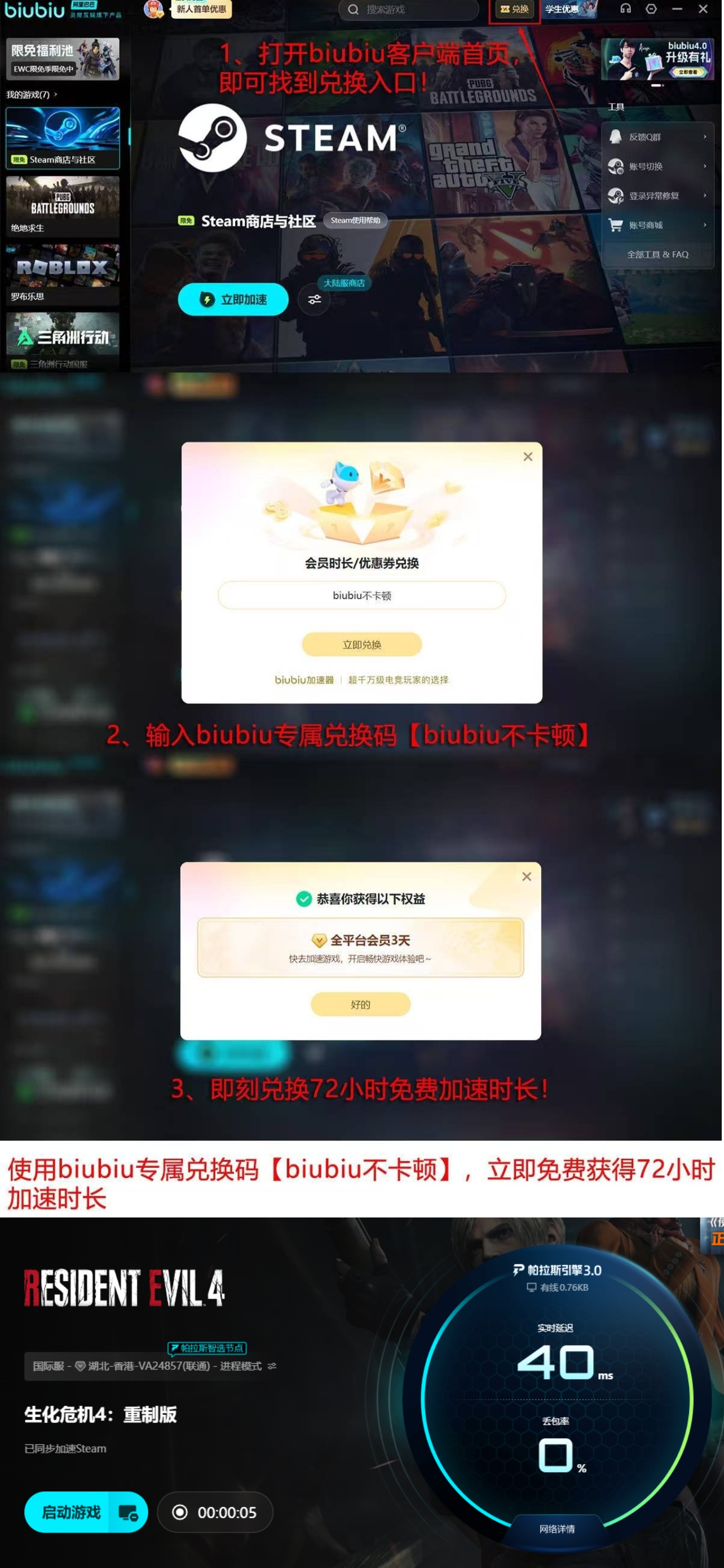当前正值biubiu加速器功能升级推广期,平台面向新用户提供专项福利:注册成功后立即获赠24小时全场景无门槛加速权益!输入专属激活口令【biubiu不卡顿】,还可额外领取72小时高品质加速时长,累计免费体验时长达96小时!即刻启用,保障《生化危机4》全程流畅运行。