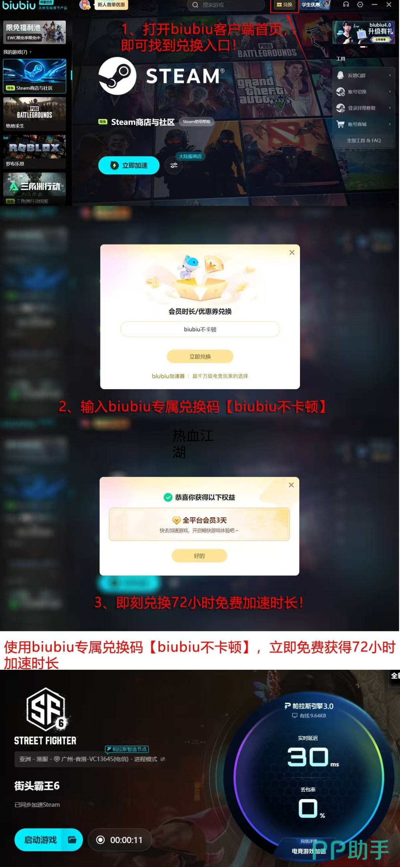 新用户注册biubiu加速器账户后,可立即领取24小时全游戏免费加速时长。当前平台开放通用兑换活动,所有用户输入口令【biubiu不卡顿】即可额外获得72小时加速权益。叠加新人礼包后,总计可享96小时无限制加速服务,覆盖《街头霸王6》完整赛季周期。