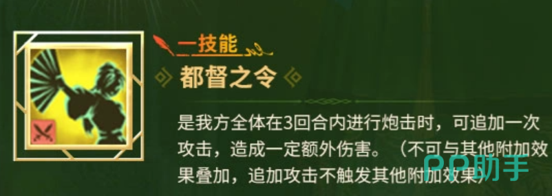 一技能【都督之令】:我方全体单位在接下来3回合内发动炮击时,额外追加一次攻击,造成固定数值伤害;该效果不可与其他增益类附加效果叠加,且追加攻击不会触发任何其他技能或被动效果。