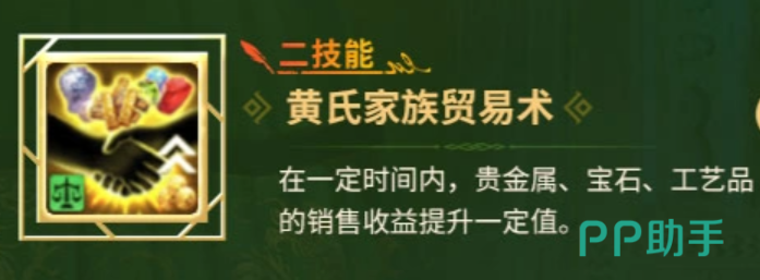 二技能【黄氏家族贸易】:激活后,在持续时间内提升贵金属、宝石、工艺品三类商品的销售收益,增幅为固定百分比值。