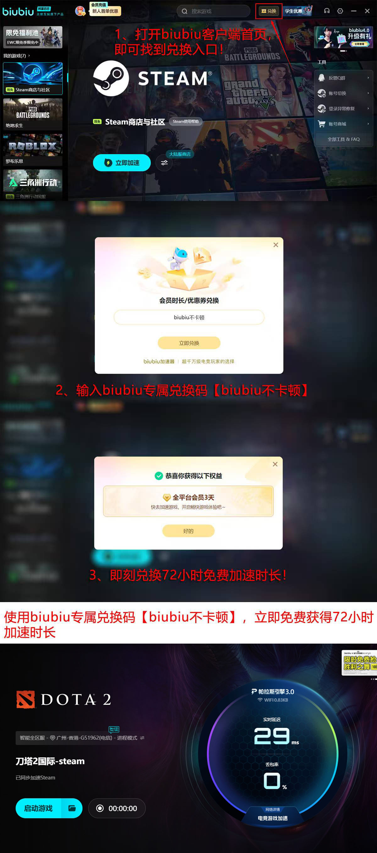 对于新用户,biubiu加速器提供分层试用权益:完成注册即可获得24小时全功能体验;登录客户端后,在活动入口输入口令【biubiu不卡顿】,额外领取72小时加速时长,新用户累计可用时长达96小时。建议优先启用“智能线路优选”与“电竞低延迟模式”,结合本地网络环境自动匹配最优参数组合。