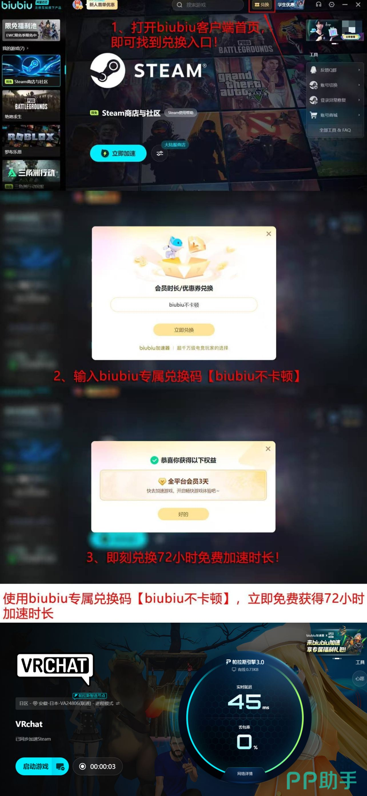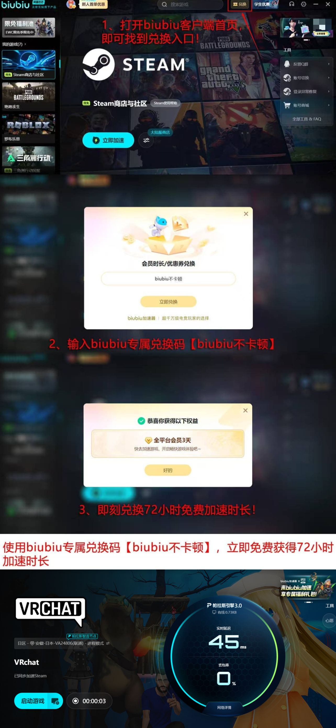 新用户注册即赠24小时全功能试用权限,无需手动领取;另设通用福利通道,所有用户(含老用户)均可凭口令【biubiu不卡顿】在指定入口一键激活72小时深度体验资格,该权益无时间窗口限制,可随时启用。