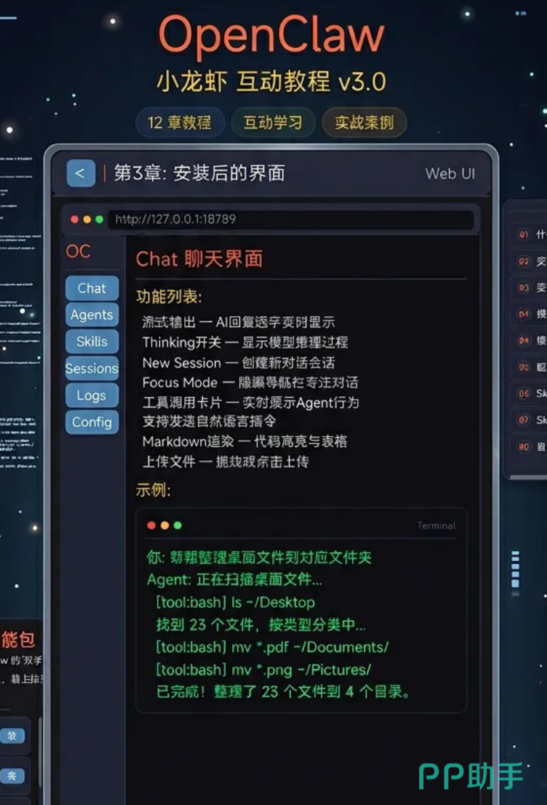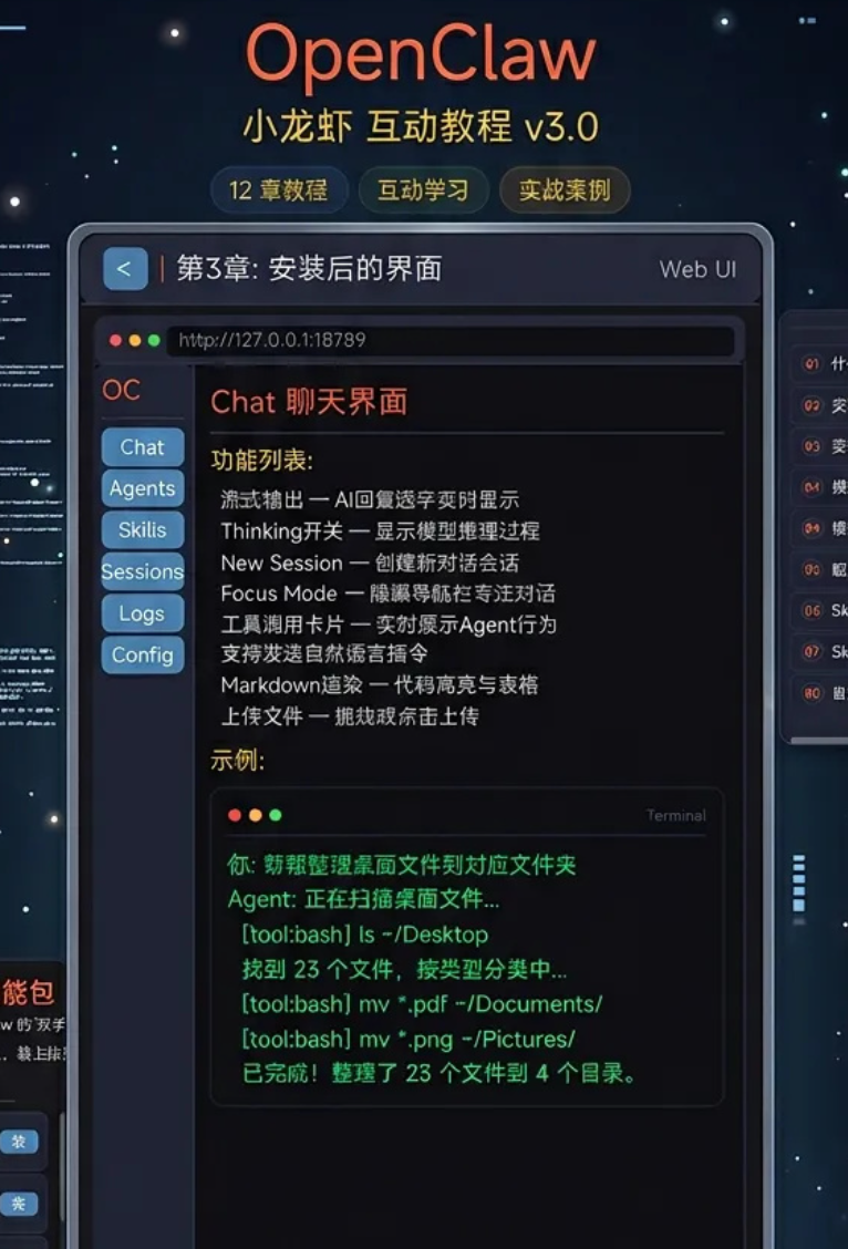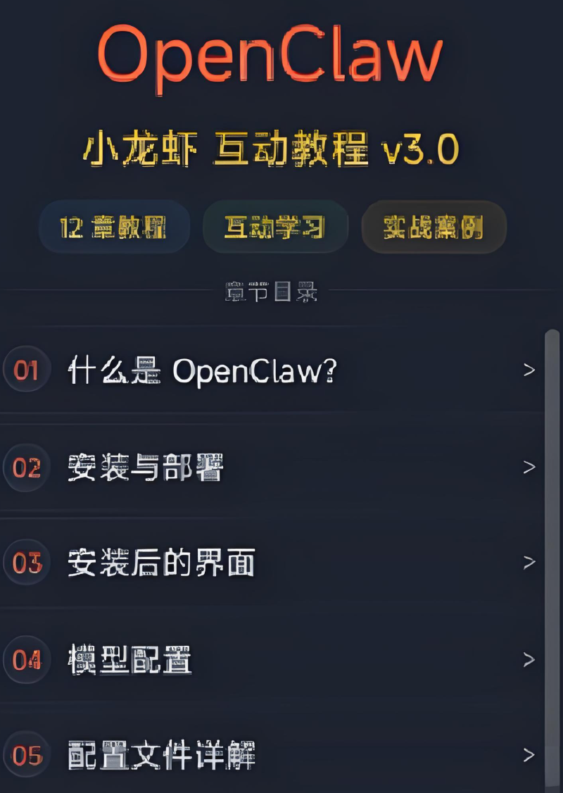 内容设计兼顾广度与深度。课程体系共设十二个章节,严格遵循由浅入深的递进结构,完整覆盖Open Claw的核心功能特性。除基础操作外,教程还提供即插即用的技能包组件,支持用户快速调用预置AI能力,进而开展自定义技能开发实践。每一章节均配备明确的学习目标、实操步骤与结果验证机制,确保知识转化率与技能迁移效率。