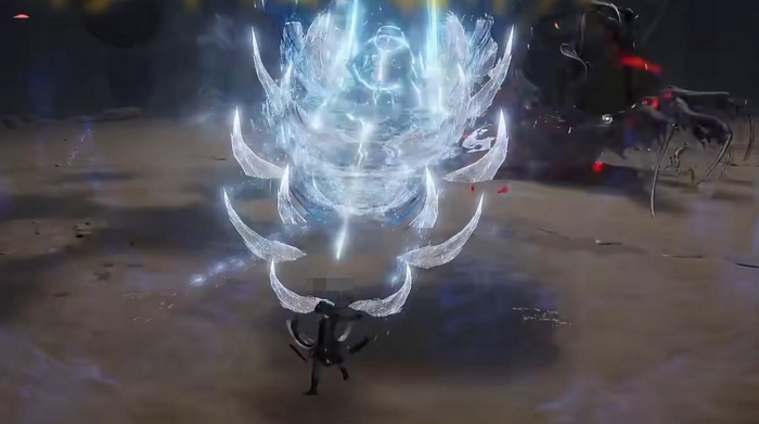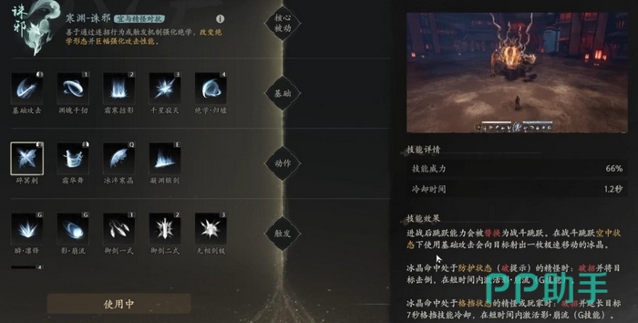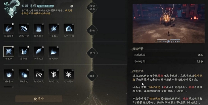 以“诛邪”专精为例,其技能体系呈现典型资源驱动特征:基础三连击可积攒能量;小技能“寒冰旋涡”具备持续范围伤害;位移技支持空中接续攻击;大招“冰锥天降”覆盖扇形区域;终极技“蓄力冰枪”附带贯穿效果与气浪冲击波,形成多层伤害结构。