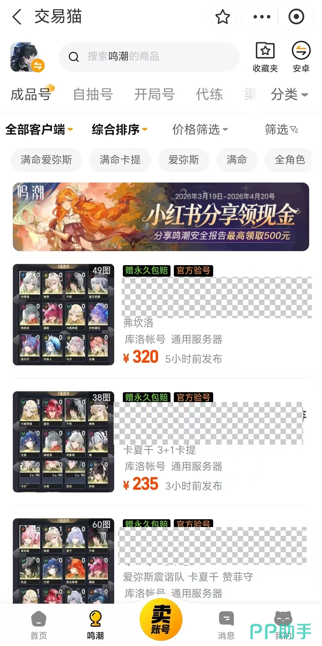 安卓用户可通过官方渠道下载安装,iOS用户可访问交易猫官网完成注册与使用。进入平台后,在搜索栏输入“鸣潮”,即可进入专属游戏专区。该专区覆盖多种账号类型:含初始资源充足的开局号、已抽取指定五星角色的自抽号,以及满命座+满练度+全套毕业装备的成品号。支持按等级、战力、角色池、武器配置等多维度筛选,大幅提升选号效率。
