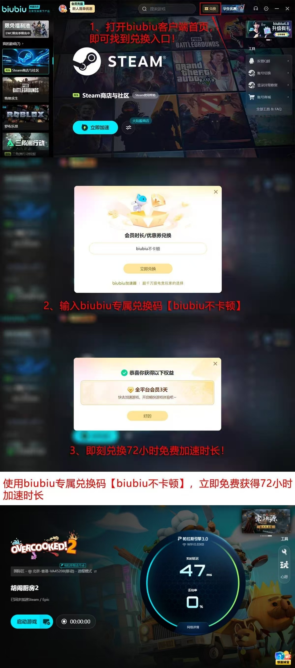 新用户完成注册后即可立即启用首日24小时全功能试用权限;在激活界面输入专属口令【biubiu不卡顿】,还可额外获赠72小时加速时长,累计享有96小时无限制联机优化服务。