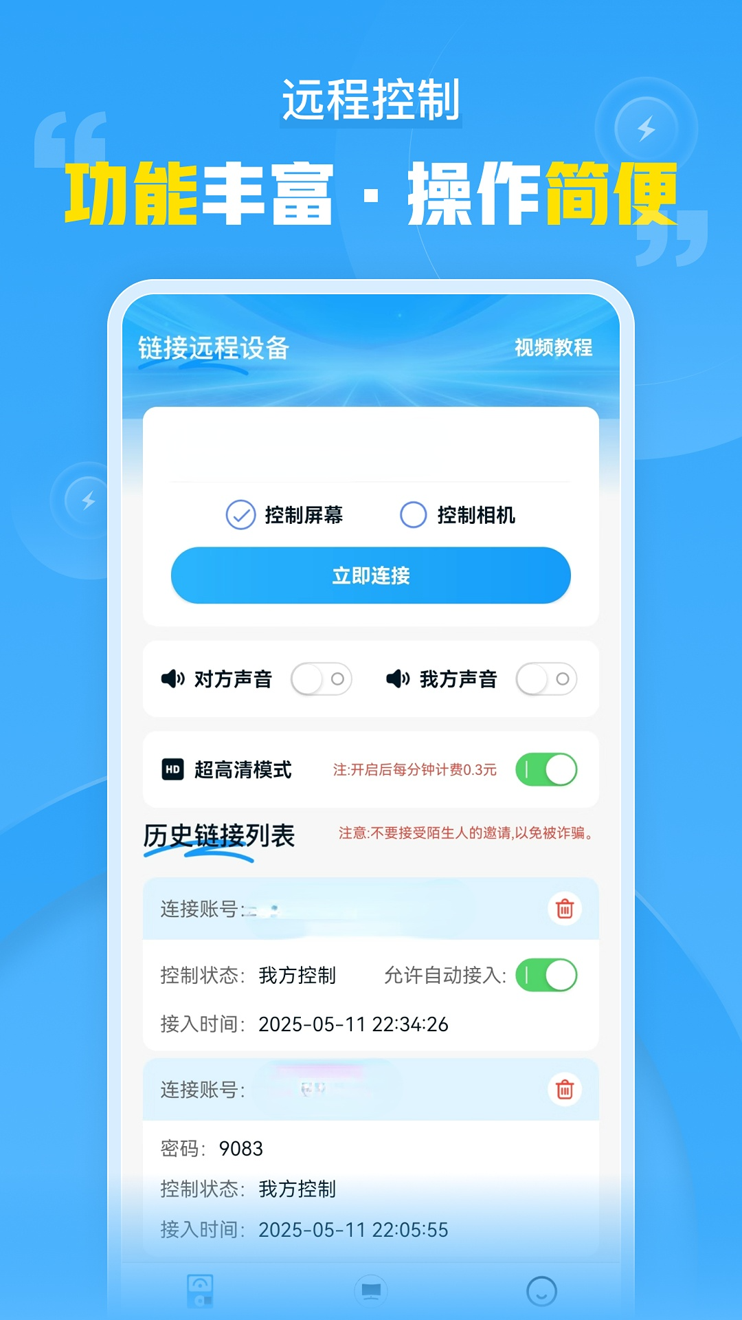 最大的特点就是省事,像一张一次性便利贴,不用复杂的安装和设置,打开就能用。它支持用控制码来快速连接设备,只要把控制码告诉对方,就能快速建立连接。平时临时需要远程协助别人,或者别人帮自己解决设备问题,用它都很方便,不用浪费时间在安装和设置上。它还支持外接键鼠,接上之后操作起来就和本地电脑没区别,出差时用手机处理复杂倍感任务,也能提高效率。