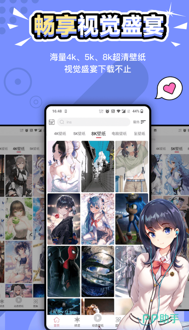 图片分享社区起家,沉淀了数十亿张高清无水印图片。壁纸板块覆盖二次元、治愈系、极简、风景、明星、插画这些风格,热门IP同人到小众原创插画都能搜到。所有壁纸支持免费下载收藏,个人专辑可以无限量存图,相当于私人美图网盘。搜索功能做得精准,输入关键词就能快速定位同风格壁纸,还能通过用户创建的专辑批量获取成套美图。