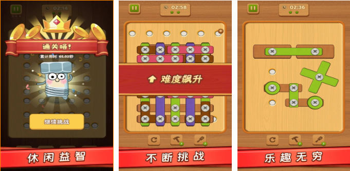 螺丝钉解谜以机械组装为核心概念,构建出一套自洽的竖屏互动解谜逻辑。玩家需通过旋转、嵌套、连接不同规格螺丝钉完成结构搭建或机关触发,关卡难度梯度合理,既考验空间想象力,也强调步骤顺序与因果关系。界面简洁明亮,动画流畅,全程无内购提示,是解谜爱好者验证逻辑能力的理想选择。