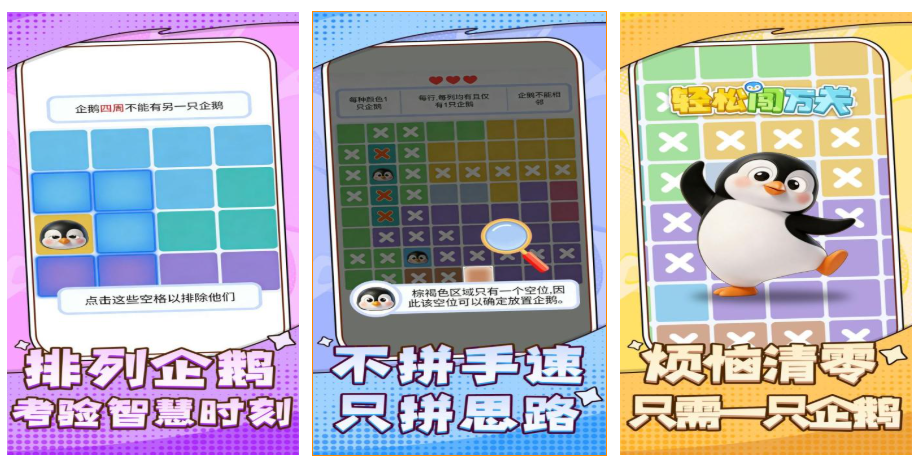 一款基于约束满足原理的极简逻辑解谜游戏。主界面为标准方格棋盘,每行每列至多放置一只企鹅;左右两侧标注各列所需企鹅数量,底部显示待部署总数。玩家需依据行列数字提示,结合“相邻禁令”(任意两只企鹅不可处于同一行或列的紧邻格)进行唯一性推演。界面完全摒弃冗余元素,仅用色块、数字与符号表达规则,确保注意力集中于逻辑推导本身。