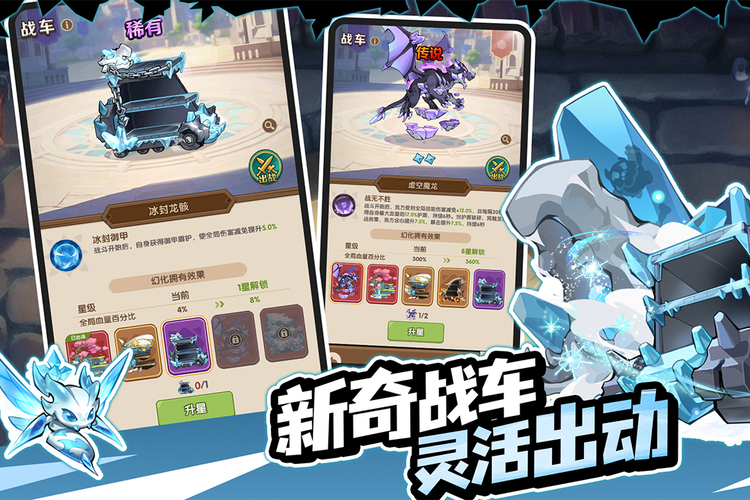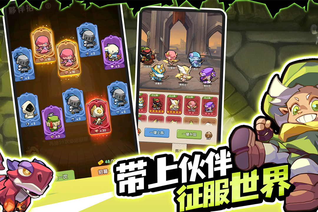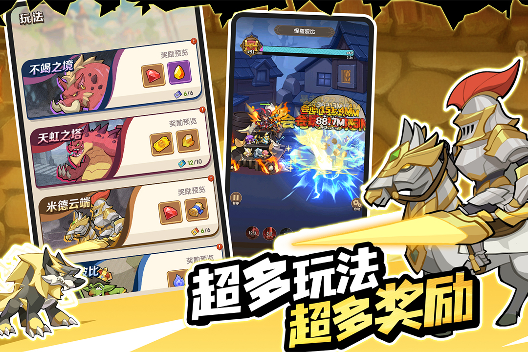 除了爽快的战斗之外,游戏里也存在着很多种的养成系统。战车、弓箭手、神器、宠物等各种各样的养成内容应有尽有,全方位提高你的角色实力。你可以根据自己的爱好来挑选各种各样的资源,轻松地组建出一套强大的阵容。不论是加大战车防御,改善弓箭手暴击,每一次决定都会使玩家的冒险队伍更加强大,更能轻松应付前方危机四伏的考验。