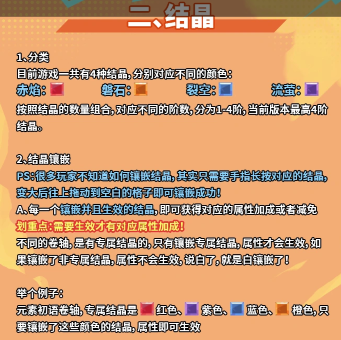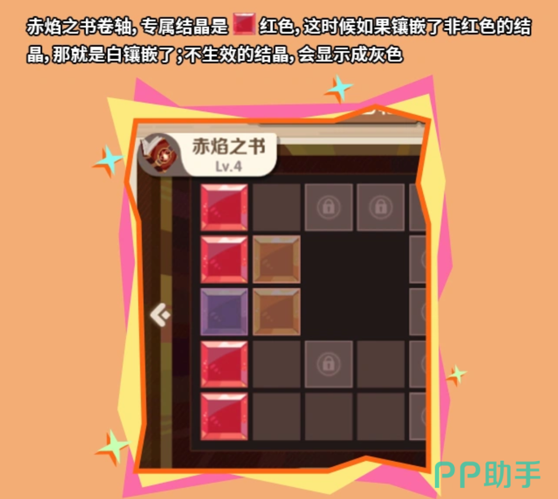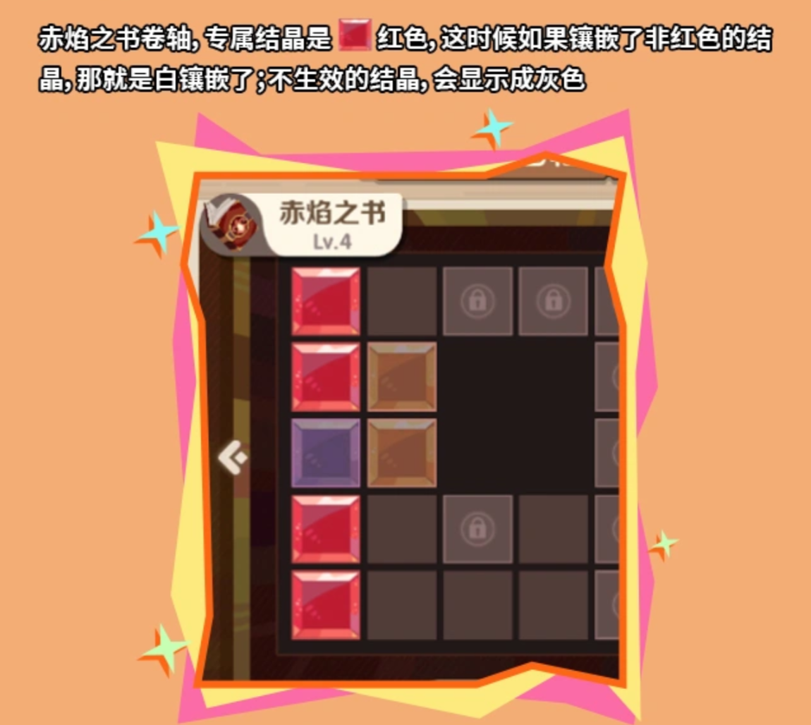 首先要了解的是魔法卷轴系统中四个基本的结晶。这四种结晶分别有红色、橙色、蓝色、紫色四种颜色以及相应的作用,即赤焰结晶(红色),磐石结晶(橙色),裂空结晶(蓝色),流萤结晶(紫色)。四种颜色结晶数目相加得到的不同阶数为4阶。殿下只需要长按对应的结晶,等它变大之后再拖到空白格子上就可以镶嵌了。但是不同的卷轴会有专属的结晶颜色。赤焰之书只能镶嵌红色的赤焰结晶才能生效,如果镶嵌了其他颜色,则属性不能生效,图标也会变成灰色,造成资源浪费。