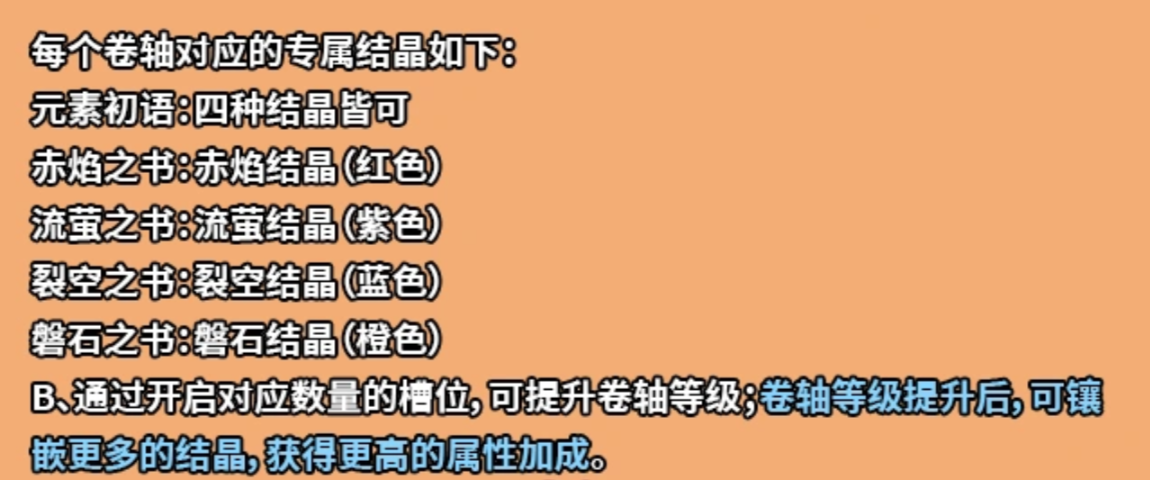 除此之外还有种非常特别的“万能”结晶,就是元素初语卷轴。与其它单方面的属性卷轴不同,元素初语卷轴是十分广泛的。它的专属结晶可以镶嵌红色、紫色、蓝色、橙色这四种颜色。这就意味着,只要你手中的有效结晶可以镶嵌到元素初语卷轴上,并且能够获得相应的属性加成。因此元素初语卷轴成了前期过渡和属性补充的最好选择,大大提高了资源的利用率。