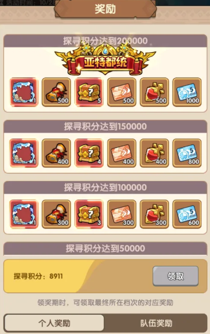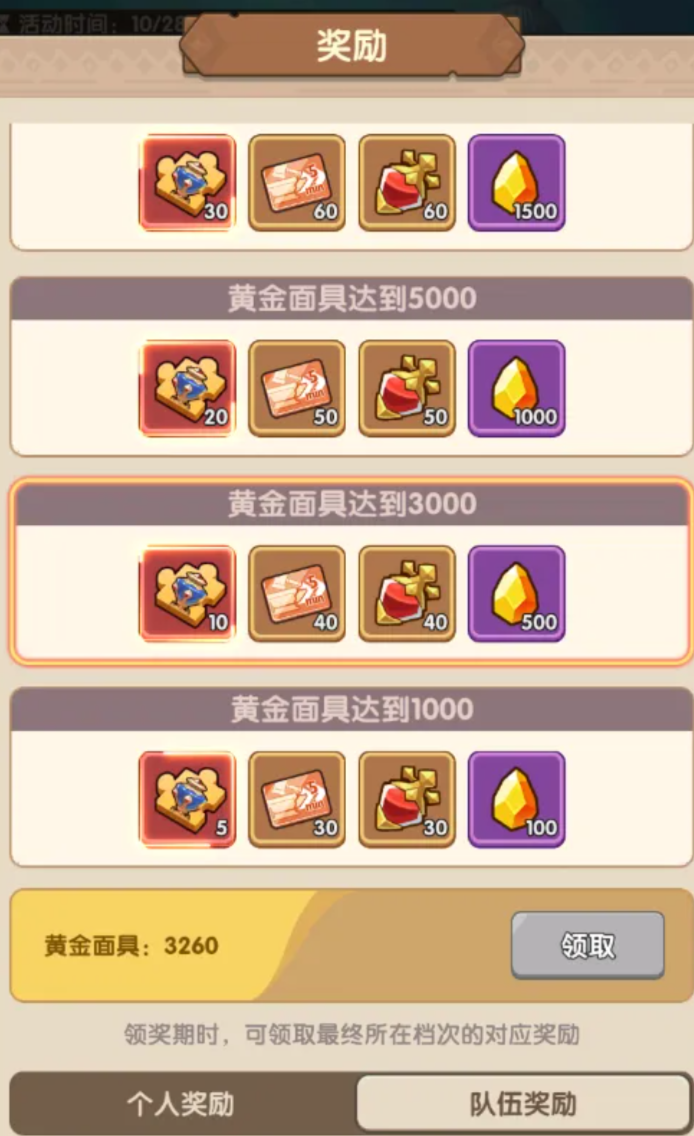 时间管理是参加活动的前提。殿下必须牢记活动时间的节点,否则就会错过。战斗期设在每天的10点至22点,是大家冲杀疆场、获得积分的好时光。每天的00:00至10:00、22:00至24:00之间为休战期,玩家可以在这一段时间内休息或者安排第二天的路线。最后的领奖期是在活动结束之后,根据玩家在战斗期内获得的探寻积分、黄金面具的数量,来发放个人和队伍的奖励。