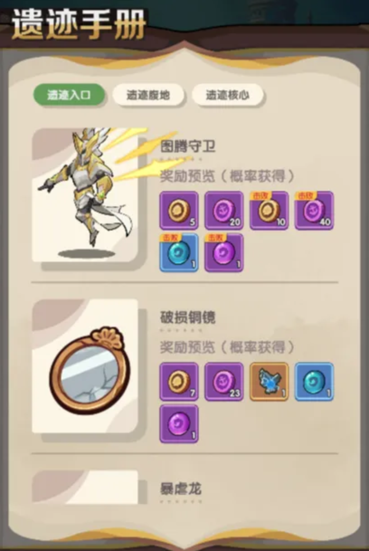 遗迹的探寻方式有三种,即遗迹入口、遗迹中心地、遗迹的核心部分。每一层都会消耗干粮道具,干粮会随时间自然恢复,但是为了提高效率、获得更好的排名,也可以去商城购买干粮。除干粮之外,在探索过程中还可以获得传送石,使用传送石或者直接击败指定的怪物都可以使玩家迅速到达下一个区域,从而缩短跑图时间。